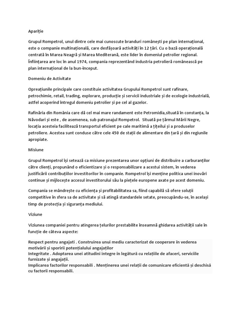 care desfoar activiti n 12 ri. Cu o baz operaional centrat n Marea Neagr i Marea Mediteran, este lider n domeniul petrolier regional. nfiinarea are loc n anul 1974, compania reprezentnd industria petrolier romneasc pe plan internaional de la bun-nceput. Domeniu de Activitate Opreaiunile principale care constituie activitatea Grupului Rompetrol sunt rafinare, petrochimie, retail, trading, explorare, producie i servicii industriale i de ecologie industrial, astfel acoperind ntregul domeniu petrolier i pe cel al gazelor. Rafinria din Romnia care d cel mai mare randament este Petromidia,situat n constana, la Nvodari i este , de asemenea, sub patronajul Rompetrol. Situat pe rmul Mrii Negre, locaia acesteia faciliteaz transportul eficient pe cale maritim a ieilui i a produselor petroliere. Acestea sunt conduse ctre cele 450 de staii de alimentare din ar i din regiunile apropiate. Misiune Grupul Rompetrol i seteaz ca misiune prezentarea unor opiuni de distribuire a carburanilor ctre clieni, propunnd o eficientizare i o responsabilizare a acestui sistem, n vederea justificrii contribuiilor investitorilor n companie. Rompetrol i menine politica unei inovri continue i mijlocete accesul investitorului su la pieele europene axate pe acest domeniu. Compania se mndrete cu eficiena i profitabilitatea sa, fiind capabil s ofere soluii competitive n sfera sa de activitate i s ating standardele setate, preocupndu-se, n acelai timp de protecia i sigurana mediului. Viziune Viziunea companiei pentru atingerea elurilor prestabilite nseamn ghidarea activitii sale n funcie de cteva aspecte: Respect pentru angajati . Construirea unui mediu caracterizat de cooperare n vederea motivrii i sporirii potenialului angajailor Integritate . Adoptarea unei atitudini integre n legtur cu relaiile de afaceri, serviciile furnizate i angajaii. Implicarea factorilor responsabili . Meninerea unei relaii de comunicare eficient i deschis cu factorii responsabili.