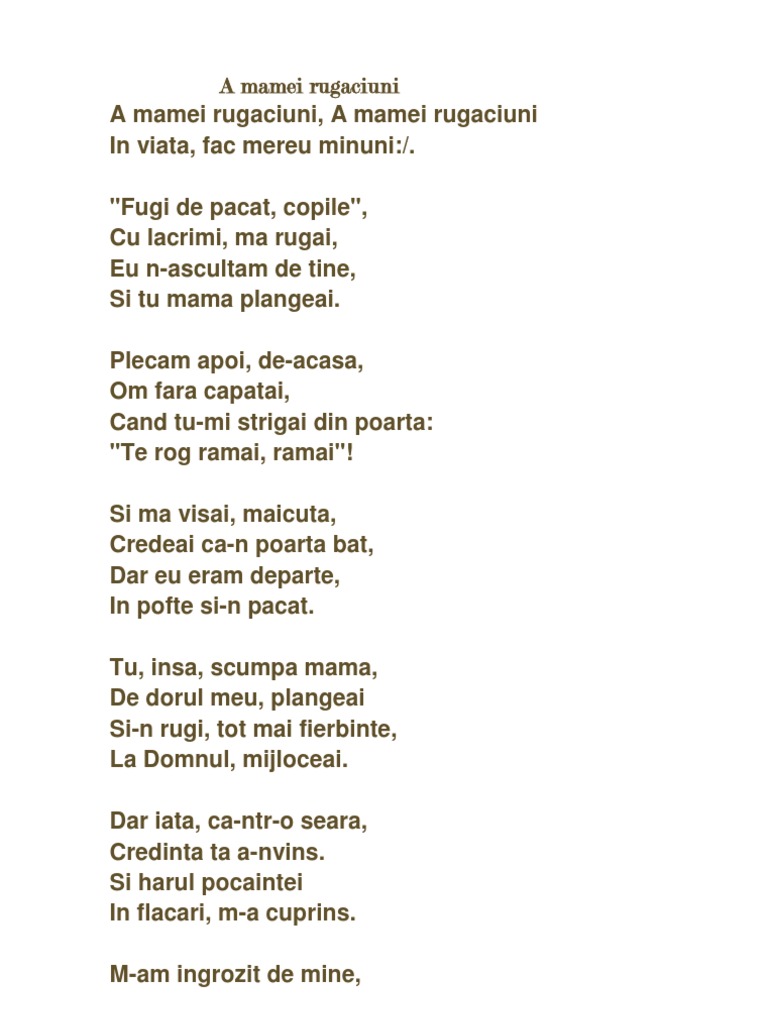 "Fugi de pacat, copile", Cu lacrimi, ma rugai, Eu n-ascultam de tine, Si tu mama plangeai. Plecam apoi, de-acasa, Om fara capatai, Cand tu-mi strigai din poarta: "Te rog ramai, ramai"! Si ma visai, maicuta, Credeai ca-n poarta bat, Dar eu eram departe, In pofte si-n pacat. Tu, insa, scumpa mama, De dorul meu, plangeai Si-n rugi, tot mai fierbinte, La Domnul, mijloceai. Dar iata, ca-ntr-o seara, Credinta ta a-nvins. Si harul pocaintei In flacari, m-a cuprins. M-am ingrozit de mine,