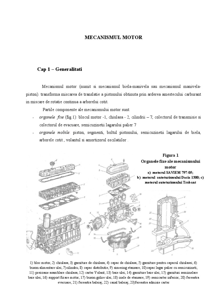 Mecanismul motor (numit si mecanismul biela-manivela sau mecanismul manivelapiston). transforma miscarea de translatie a pistonului obtinuta prin arderea amestecului carburant in miscare de rotatie continua a arborelui cotit. Partile componente ale mecanismului motor sunt: