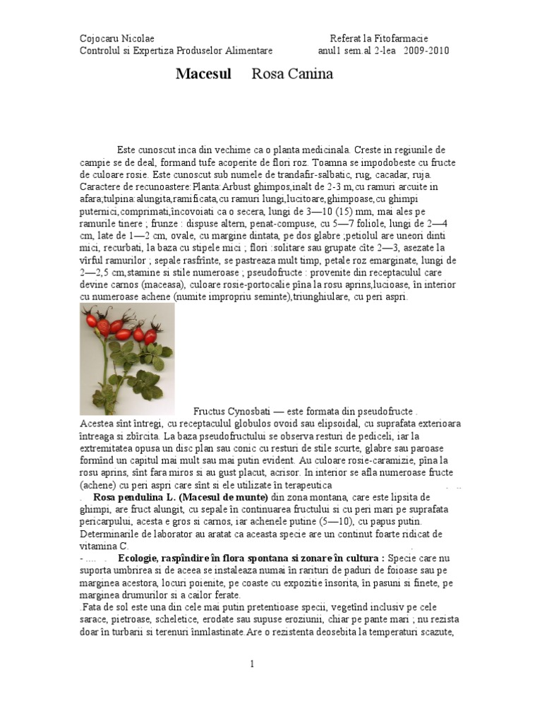 ultima decada a lunii august n judetele din Muntenia si Oltenia, n septembrie n podisul Transilvaniei si Moldova si pe la mijlocul lunii octombrie n judetele cu clima cea mai rece (Covasna, Mures, Harghita), precum si la altitudini mai mari sau n zona depresiunilor subcarpatice pe versantii nordici. . .. . Actiune farmacodinamica utilizari terapeutice : Datorita continutului ridicat n acid ascorbic si dehidroascorbic care formeaza un sistem redox", produsele farmaceutice sau alimentare joaca un rol important att n oxidoreducerile biologice ct si n respiratia celulara. Datorita celorlalte vitamine si n special vitaminei P au proprietatea de a scadea permeabilitatea si fragilitatea capilarelor. Aduc un aport de saruri necesare organismului si au actiune diuretica. Se recomanda n avitaminoza C, n afectiuni hepatice si renale, ca [Link] n compozitia ceaiurilor aromat, hepatic nr. 2, ceai tonic aperitiv, iar achenele n ceaiul diuretic nr. [Link] pulpa pseudofructelor se prepara siropuri (sirop de macese,Sambucovit), gemuri, dulceata, vin. Pentru a nu pierde n timpul prelucrarii vitamina C se recomanda recipienti [Link], datorit coninutului mare de vitamine, mceul este un excelent vitaminizant natural. Vitamina C condiioneaz buna funcionare a tuturor celulelor, ea jucnd un rol esenial n procesele metabolice fundamentale, i anume n reaciile de oxidoreducere i n respiraia celular. De asemenea, mceele cresc rezistena capilarelor sanguine, care devin astfel mai puin fragile. In plus,unii autori i menioneaz proprietile astringente, antidiareice,diuretice, precum i faptul c stimuleaz pofta de mncare i [Link] farmaceutice sau alimentare din mcee sunt indicate n prevenirea i tratarea rcelilor, a gripei, la bolnavii cu hipovitaminoz, precum i la cei aflai n convalescen, ca tonic i stimulent general. Unii autori le recomand i n afeciunile vasculare pentru meninerea elasticitii capilarelor sanguine. . Preparare i administrare Infuzia se prepar din 2 linguri de mcee la 1/2 litru de ap. Se tine 10 minute la infuzat n ap fierbinte, dup care se [Link] de ceai rezultat se bea pe parcursul unei zile. Decoctul se poate prepara din 2 linguri de mcee zdrobite, la 2 cni de ap. Se fierb 10 minute i se beau 2 cni pe [Link] uscat de pulp de mcee consumat zilnic, n cantitate de 3-4 g, asigur necesarul zilnic de vitamina C al unui adult. Pulberea se prepar prin separarea pulpei uscate de semine i periori i mcinarea acesteia. Intr n compoziia ceaiului aromat, hepatic nr. 2 i tonic aperitiv,a granulelor Rozavit, a unguentului Dumasen, a siropului Eficardin i Efitonic, a comprimatelor Neuromion i Plantofort. Sunt foarte apreciate pentru continutul lor bogat in vitamina C si a cantitatilor mai mici din vitaminele A, B1, B2, P, K, acid nicotinic (vitamina antipelagroasa). Pe langa vitamine, macesele mai contin zharuri, acid citric si malic, pectine, tanini etc. In terapeurica se folosesc ca tonic vitaminizant, avand proprietatea de a intari organismul. La convalescenti sunt recomandate sub forma de ceai, sirop, marmelada si vin. Datorita vitaminei P, preparatele de macese mentin permeabilitatea si fragilitatea vaselor capilare, normalizand circulatia sangelui. Macesele au insusirea de a mari secretia biliara, fiind indicate in afectiunile ficatului. Unii autori recomanda fructele de maces in starile de inflamatie intestinala, iar dupa altii ar combate piatra la rinichi si vezica. Ceaiul de macese este diuretic, marind cantitatea de urina in 24 de ore. Aceasta insusire este atribuita in special semintelor. Neproducand nici o iritatie, este recomandat