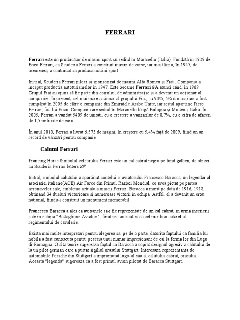 Ferrari este un productor de masini sport cu sediul n Maranello (Italia). Fondat n 1929 de Enzo Ferrari, ca Scuderia Ferrari a construit masini de curse, iar mai trziu, n 1947, de asemenea, a continuat sa produca masini sport . Iniial, Scuderia Ferrari piloi i sponsorizat de masini Alfa Romeo i Fiat . Compania a inceput productia autoturismelor n 1947. Este became Ferrari SA atunci cnd, n 1969 Grupul Fiat au ajuns s fie parte din consiliul de administraie i a devenit un acionar al companiei. n prezent, cel mai mare actionar al grupului Fiat, cu 90%, 5% din aciuni a fost cumprat n 2005 de ctre o companie din Emiratele Arabe Unite, iar restul aparine Piero Ferrari, fiul lui Enzo. Compania are sediul n Maranello lng Bologna i Modena, Italia. n 2005, Ferrari a vandut 5409 de unitati, cu o crestere a vanzarilor de 8,7%, cu o cifra de afaceri de 1,5 miliarde de euro. n anul 2010, Ferrari a livrat 6.573 de maini, n cretere cu 5,4% fa de 2009, fiind un an record de vnzri pentru companie