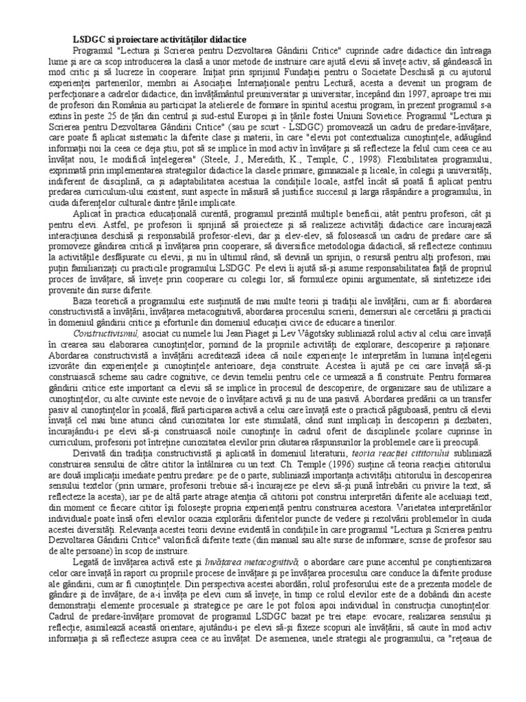 LSDGC si proiectare activitilor didactice Programul "Lectura i Scrierea pentru Dezvoltarea Gndirii Critice" cuprinde cadre didactice din
