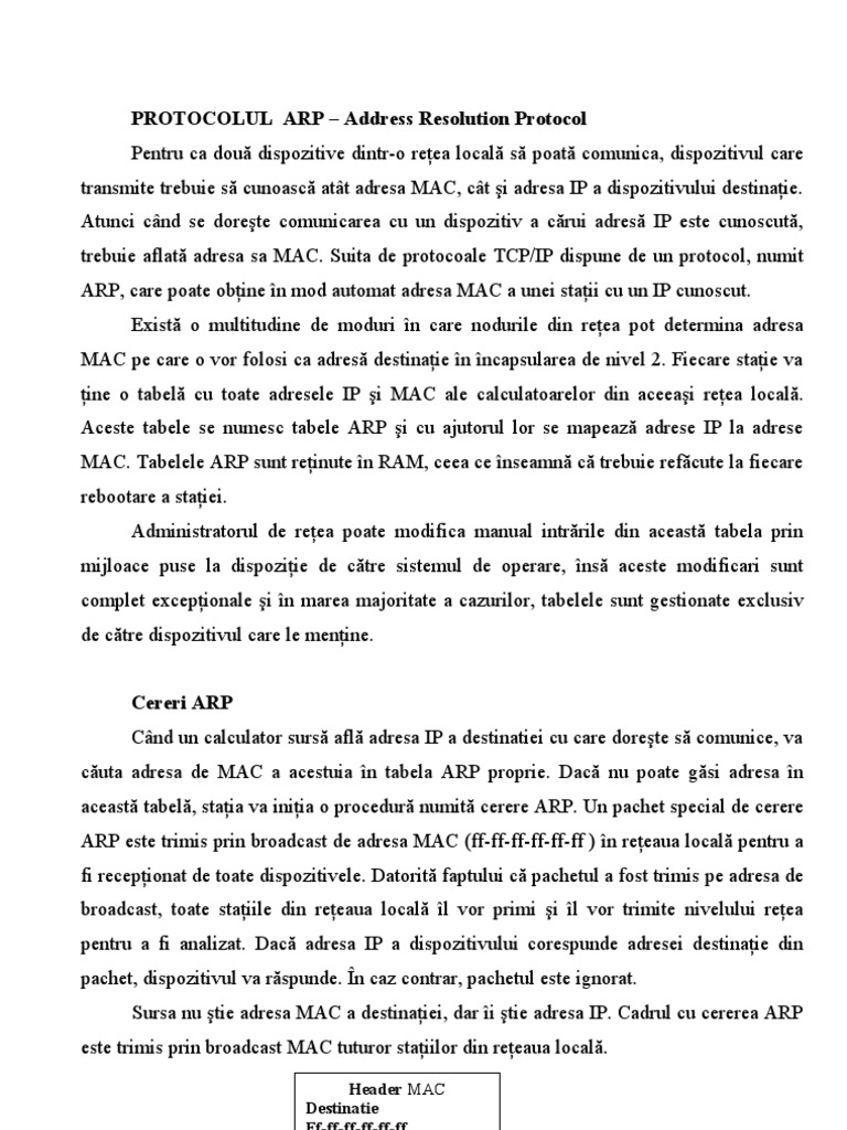 e transmite trebuie s cunoasc att adresa MAC, ct i adresa IP a dispozitivului destinaie. Atunci cnd se dorete comunicarea cu un dispozitiv a crui adres IP este cunoscut, trebuie aflat adresa sa MAC. Suita de protocoale TCP/IP dispune de un protocol, numit ARP, care poate obine n mod automat adresa MAC a unei staii cu un IP cunoscut. Exist o multitudine de moduri n care nodurile din reea pot determina adresa MAC pe care o vor folosi ca adres destinaie n ncapsularea de nivel 2. Fiecare staie va ine o tabel cu toate adresele IP i MAC ale calculatoarelor din aceeai reea local. Aceste tabele se numesc tabele ARP i cu ajutorul lor se mapeaz adrese IP la adrese MAC. Tabelele ARP sunt reinute n RAM, ceea ce nseamn c trebuie refcute la fiecare rebootare a staiei. Administratorul de reea poate modifica manual intrrile din aceast tabela prin mijloace puse la dispoziie de ctre sistemul de operare, ns aceste modificari sunt complet excepionale i n marea majoritate a cazurilor, tabelele sunt gestionate exclusiv de ctre dispozitivul care le menine. Cereri ARP Cnd un calculator surs afl adresa IP a destinatiei cu care dorete s comunice, va cuta adresa de MAC a acestuia n tabela ARP proprie. Dac nu poate gsi adresa n aceast tabel, staia va iniia o procedur numit cerere ARP. Un pachet special de cerere ARP este trimis prin broadcast de adresa MAC (ff-ff-ff-ff-ff-ff ) n reeaua local pentru a fi recepionat de toate dispozitivele. Datorit faptului c pachetul a fost trimis pe adresa de broadcast, toate staiile din reeaua local l vor primi i l vor trimite nivelului reea pentru a fi analizat. Dac adresa IP a dispozitivului corespunde adresei destinaie din pachet, dispozitivul va rspunde. n caz contrar, pachetul este ignorat. Sursa nu tie adresa MAC a destinaiei, dar i tie adresa IP. Cadrul cu cererea ARP este trimis prin broadcast MAC tuturor staiilor din reeaua local.