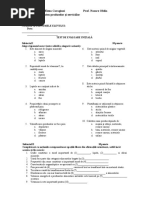 Partea I ( 30 p) [Link] litera corespunzatoare raspunsului corect: 30p 1) Acidul malic se gsete n: a) Carne b) Produse lactate c) Legume d) Fructe verzi 2) Vitamina cu rol n absoria calciului i fosforului este: a) B b) D c) C d) A 3) Deoarece proteinele iau parte la toate reaciile din organism au rol: a) Fiziologic b) Catalitic c) Plastic d) Energetic 4) Vitamina care acioneaz concomitent cu vitamina C este: a) P b) PP c) K d) F 5) Niacina sau acidul nicotinic este: a) Fierul b) Citrina c) Vitamina PP d) Vitamina B 6) Aminoacizii intr n structura: a) Lipidelor b) Glucidelor c) Proteinelor d) Acizilor organici 7) Proteinele de clasa a-III-a se gsesc n: a) Oase b) Fructe c) Legume d) Ou 8) Valoarea biologic a alimentelor este dat de coninutul n: a) Aminoacizi eseniali, acizi grai eseniali, minerale, vitamine b) Proprieti oprganoleptice i estetice c) Proteine, lipide, glucide d) Coninutul n substane nocive 9) Cu ct coninutul de gluten este mai mare cu att fina de gru este: a) De bun calitate b) Mai bogat n lipide c) Mai neagr d) Cu grad mare de extracie 10) Proprieti fizico-chimice a crupelor sunt: a) Stabilitate la fierbere