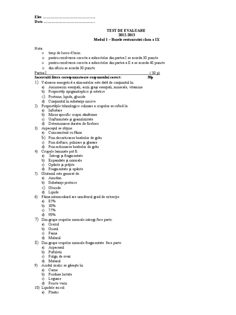 Elev .. Data . TEST DE EVALUARE 2012-2013 Modul 1 Bazele restauratiei clasa a IX Nota: o o timp de lucru:45min pentru rezolvarea corecta a subiectelor din partea a II a se acorda 40 puncte