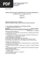 b) Granulozitate i uniformitate c) Miros specific d) Gust uor dulceag 11) Conservabilitatea pastelor finoase este cuprins ntre: a) 6 luni-un an b) O sptmn-o lun c) O lun-6 luni d) 6 sptmni-3luni 12) La fierbere proporia de ap/paste este: a) 2/1 b) 3/1 c) d) 1/2 13) Pinea graham face parte din urmtoarea categorie de produse de panificaie: a) Pine simpl b) Pine dietetic c) Produse de franzelrie d) Pine cu adaosuri 14) Inocuitatea produselor alimentare este: a) Starea de insalubritate a alimentelor b) Neconcordana cu normele igienico-sanitare c) nsuirea de a nu fi duntor pentru organism d) Asocierea alimentelor n raia zilnic 15) Biocatalizatorii organici produi de celula vie sunt: a) enzime b) aminoacizi c) proteinele din clasa a-II-a d) acizi organici Partea a II a ( 40p) 1. Completai urmtorul tabel: Produse cerealiere Mlai Paste finoase Utilizri culinare Utilizri culinare Utilizri culinare 2. Precizai caracteristicile de calitate a arpacaului.