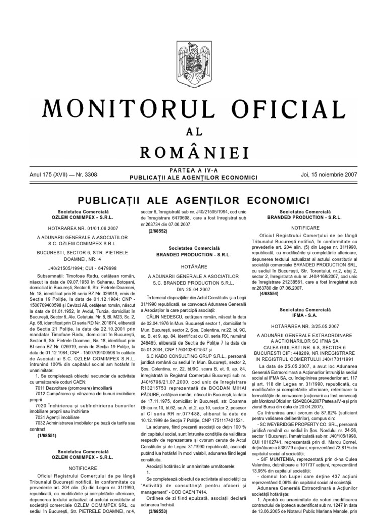 Societatea Comercial OZLEM COMIMPEX - S.R.L. HOTARAREA NR. 01/01.06.2007 A ADUNARII GENERALE A ASOCIATILOR S.C. OZLEM COMIMPEX S.R.L. BUCURESTI, SECTOR 6, STR. PIETRELE DOAMNEI, NR. 4 J40/21505/1994; CUI - 6479698 Subsemnaii: Timofoae Radu, cetean romn, nscut la data de 09.07.1950 n Suharau, Botoani, domiciliat n Bucureti, Sector 6, Str. Pietrele Doamnei, Nr. 18, identificat prin BI seria BZ Nr. 026919, emis de Secia 19 Poliie, la data de 01.12.1984; CNP 1500709400598 i Cevizci Ali, cetean romn, nscut la data de 01.01.1952, n Avdul, Turcia, domiciliat n Bucureti, Sector 6, Ale. Cetatuia, Nr. 8, Bl. M23, Sc. 2, Ap. 68, identificat prin CI seria RD Nr. 201874, eliberat de Secia 21 Poliie, la data de 22.10.2001 prin mandatar Timofoae Radu, domiciliat n Bucureti, Sector 6, Str. Pietrele Doamnei, Nr. 18, identificat prin BI seria BZ Nr. 026919, emis de Secia 19 Poliie, la data de 01.12.1984; CNP - 1500709400598 n calitate de Asociai ai S.C. OZLEM COMIMPEX S.R.L. ntrunind 100% din capitalul social am hotrt n unanimitate: 1. Se completeaz obiectul secundar de activitate cu urmtoarele coduri CAEN: 7011 Dezvoltare (promovare) imobiliar 7012 Cumprarea i vnzarea de bunuri imobiliare proprii 7020 nchirierea i subnchirierea bunurilor imobiliare proprii sau nchiriate 7031 Agenii imobiliare 7032 Administrarea imobilelor pe baz de tarife sau contract (1/68551) sector 6, nregistrat sub nr. J40/21505/1994, cod unic de nregistrare 6479698, care a fost nregistrat sub nr.263734 din 07.06.2007. (2/68552) Societatea Comercial BRANDED PRODUCTION - S.R.L. NOTIFICARE Oficiul Registrului Comerului de pe lng Tribunalul Bucureti notific, n conformitate cu prevederile art. 204 alin. (5) din Legea nr. 31/1990, republicat, cu modificrile i completrile ulterioare, depunerea textului actualizat al actului constitutiv al societii comerciale BRANDED PRODUCTION SRL, cu sediul n Bucureti, Str. Torentului, nr.2, etaj 2, sector 2, nregistrat sub nr. J40/4168/2007, cod unic de nregistrare 21238561, care a fost nregistrat sub nr.263780 din 07.06.2007. (4/68554)
