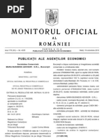 numerotate de la 811 la 960 inclusiv i de la 1.001 la 2.000 inclusiv, reprezentind 2,2115% din capitalul social total. MEDIA PRO BV - 6.1OO lei reprezentnd aport n numerar, care deine 610 aciuni nominative, numerotate de la 1 la 610 inclusiv, n procent de 1,173% din capitalul social total Capitalul social este vrsat integral n societate. 3. Adunarea General a Acionarilor aprob reactualizarea Actului constitutiv al societii cu toate modificrile la zi, n conformitate, cu art.204, alin.7 din Legea 31/1990 modificat i republicat. Redactat i semnat n 6 (ase) exemplare originale, n limba romn, la data de 16.03.2007. (64/68617) Societatea Comercial COMPANIA DE PRODUCIE INTERTAINMENT - S.A. NOTIFICARE Oficiul Registrului Comerului de pe lng Tribunalul Bucureti notific, n conformitate cu prevederile art. 204 alin. (5) din Legea nr. 31/1990, republicat, cu modificrile i completrile ulterioare, depunerea textului actualizat al actului constitutiv al societii comerciale COMPANIA DE PRODUCIE INTERTAINMENT SA, cu sediul n Bucureti, B-dul LASCR CATARGIU, nr.46, etaj P, [Link] 7, sector 1, nregistrat sub nr. J40/12246/1998, cod unic de nregistrare 11273448, care a fost nregistrat sub nr.264564 din 07.06.2007. (65/68618) Societatea Comercial CINC COMSERVICE - S.R.L. DECIZIA ASOCIATULUI UNIC NR. 1 DIN DATA DE 07.06.2007 CINC GHEORGHE, de cetenie romn, domiciliat n Mun. Bucureti, Str. Laborator nr. 143, bl. S10, sc. 1, ap. 12, sector 3, CNP: 1540314400862, identificat cu CI seria RR nr. 404286 emis de SPCEP S3 biroul nr. 2, la data de 26.07.2006, asociat unic n cadrul S.C. CINCA COMSERVICE S.R.L., am decis: 1. Extinderea obiectului de activitate cu: COD CAEN 4522 Lucrri de nvelitori, arpante i terase la construcii;4523 Construcii de autostrzi, drumuri, aerodroame i baze sportive;4524 Construcii hidrotehnice;4525 Alte lucrri speciale de construcii;4531 Lucrri de instalaii electrice;4532 Lucrri de izolaii i protecie anticoroziv;4533 Lucrri de instalaii tehnico- sanitare;4534 Alte lucrri de instalaii;4541 Lucrri de ipsoserie;4542 Lucrri de tmplrie i dulgherie;4543 Lucrri de pardosire i placare a pereilor;4544 Lucrri de vopsitorie, zugrveli i montri de geamuri;4545 Alte lucrri de finisare;4550 nchirierea utilajelor de construcii i demolare, cu personal de deservire aferent. Ca urmare a modificrilor intervenite se va redacta un nou act constitutiv. (66/68619) Societatea Comercial CINC COMSERVICE - S.R.L. NOTIFICARE Oficiul Registrului Comerului de pe lng Tribunalul Bucureti notific, n conformitate cu prevederile art. 204 alin. (5) din Legea nr. 31/1990, republicat, cu modificrile i completrile ulterioare, depunerea textului actualizat al actului constitutiv al societii comerciale CINC COMSERVICE SRL, cu sediul n Bucureti, Str. LABORATOR, nr.143, bloc S-10, scara 1, etaj 1, ap.12, sector 3, nregistrat sub nr. J40/22273/1993, cod unic de nregistrare 4825612, care a fost nregistrat sub nr.264645 din 07.06.2007. (67/68620) Societatea Comercial APOLONIA CONSULT - S.R.L. HOTRREA NR.3/29.05.2007 A ADUNARII GENERALE A ASOCIATILOR S.C. APOLONIA CONSULT S.R.L. Subsemnatul GEORGESCU BOGDAN - NICOLAE, cetean romn, domiciliat n Braov, str. [Link] nr.19, jud. Braov, posesor al B.I. Seria G.R. nr. 807671/03.08.1995, emis de Poliia Braov, i subscrisa S.C. MENELDIL ASSOCIATED S.A., persoan juridic strin, cu sediul n Insulele Britanice Virgine, Pasea Estate Road Town, Tortole, cu numr de nmatriculare n Registrul comerului 336270/2003, reprezentat prin dna PATRUT EMILIA, n calitate de asociai ai S.C. APOLONIA CONSULT S.R.L., am hotrt urmtoarele: Articol unic - Se nfiineaz un punct de lucru n Bucureti, Piaa Unirii nr. 1, Magazinul Unirea, etajul 4, Corpul Central, zona Food Court (zona de preparare, restaurant nr.03, restaurant Crnciori cu bere La Zamfir), sector 3. Restul prevederilor rmne nemodificat. Urmeaz ca asociaii, prin reprezentantul lor, s ndeplineasc toate formalitile necesare n vederea nregistrrii n Registrul comerului a prezentei hotrri. (68/68621)