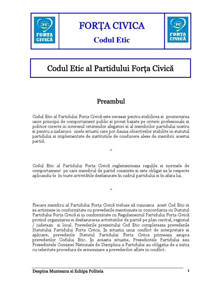 5 zile de la primirea unei notificari oficiale) punctul de vedere in fata organismelor statutare ale Partidului Forta Civica. c) Sanctiunea disciplinara adoptata va fi adusa la cunostinta celorlalti membri ai Partidului Forta Civica, precum si a opiniei publice intr-un interval maxim 2 zile de la epuizarea tuturor cailor interne de recurs (apel). Deciziile de etapa adoptate de forurile statutare ale Partidului Forta Civica pana la epuizarea cailor interne de apel vor fi aduse de indata la cunostinta opiniei publice prin publicarea lor la rubrica Sanctiuni disciplinare de pe site-ul Partidului in maxim 2 zile de la adoptarea unei sanctiuni. Articolul 5 a) Membrii Partidului Forta Civica sunt obligati sa dovedeasca in actiunile lor politice si mediatice patriotism, onestitate, corectitudine si responsabilitate fata de prezentul si viitorul Romaniei si al cetateniilor romani din tara si din diaspora. b) Orice declaratie sau atitudine care denota rasism, xenofobie, antisemitism, negationism sau alte declaratii sau atitudini asimilate acestora, precum si declaratia falsa facuta cu ocazia semnarii cererii de adeziune la Partidul Forta Civica atrag excluderea din partid fara drept de recurs si fara posibilitatea reprimirii in partid. c) Sanctiunea excluderii din partid este fi adoptata cu respectarea prevederilor art. 18-22 din Statutul Partidului Forta Civica, in functie de pozitia membrului respectiv in cadrul partidului. d) Membrul pentru care s-a cerut excluderea din partid are dreptul de a adresa organismelor centrale ale Partidului Forta Civica (Presedintelui Partidului si/sau Biroului Permanent National si/sau Comisiei Nationale de Disciplina), intr-un termen de maxim 5 zile de la primirea unei notificari oficiale, un raport scris in care isi va expune punctul de vedere cu privire la cele imputate. Lipsa raportului scris al membrului in cauza la finalul celor 5 zile nu suspenda procedura de sanctionare disciplinara. Organismul care a primit raportul scris poate propune sau poate dispune (dupa caz), cu respectarea Statutului si Codului Etic al Partidului Forta Civica, decizii cu rol procedural in vederea solutionarii cu celeritate a cauzei. Articolul 6 Membrilor Partidului Forta Civica, care au fost alesi prin vot direct intr-o functie publica, pe langa obligatiile politice si etice derivate din Statutul Partidului Forta Civica si din prezentul Cod Etic, le incumba si obligatia de a mentine un contact Despina Munteanu si Echipa Politeia 3