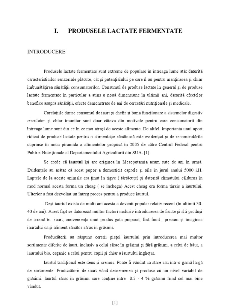 Produsele lactate fermentate sunt extreme de populare n ntreaga lume att datorit caracteristicilor senzoriale plcute, ct i potenialului pe care l au pentru meninerea i chiar mbuntirea sntii consumatorilor. Consumul de produse lactate n general i de produse lactate fermentate n particular a atins o nou dimensiune n ultimii ani, datorit efectelor benefice asupra sntii, efecte demonstrate de ani de cercetri nutriionale i medicale. Corelaiile dintre consumul de iaurt i chefir i buna funcionare a sistemelor digestiv circulator i chiar imunitar sunt doar cteva din motivele pentru care consumatorii din ntreaga lume sunt din ce n ce mai atrai de aceste alimente. De altfel, importanta unui aport ridicat de produse lactate pentru o alimentaie sntoas este evideniat i de recomandrile cuprinse n noua piramida a alimentelor propus n 2005 de ctre Centrul Federal pentru Politici Nutriionale al Departamentului Agriculturii din SUA. [1] Se crede c iaurtul i are originea n Mesopotamia acum sute de ani n urm. Evidenele au artat c acest popor a domesticit caprele i oile n jurul anului 5000 i.H. Laptele de la aceste animale era inut n tigve ( trtcue) i datorit climatului clduros n mod normal acesta forma un cheag ( se nchega) Acest cheag era forma trzie a iaurtului. Ulterior a fost dezvoltat un ntreg proces pentru a produce iaurtul. Dei iaurtul exista de multi ani acesta a devenit popular relativ recent (n ultimii 3040 de ani). Acest fapt se datoreaz multor factori inclusiv introducerea de fructe i alti produi de arom n iaurt, conveniena unui produs gata preparat, fast food , precum i imaginea iaurtului ca i aliment sntos srac n grsimi. Productorii au rspuns cererii pieei iaurtului prin introducerea mai multor sortimente diferite de iaurt, inclusiv a celui srac n grsimi i fr grsimi, a celui de but, a iaurtului bio, organic a celui pentru copii i chiar a iaurtului ngheat. Iaurtul tradiional este dens i cremos. Poate fi vndut ca atare sau ntr-o gam larg de sortimente. Productorii de iaurt vnd deasemenea i produse cu un nivel variabil de grsimi. Iaurtul srac n grsimi care conine ntre 0.5 - 4 % grsimi fiind cel mai bine vndut.