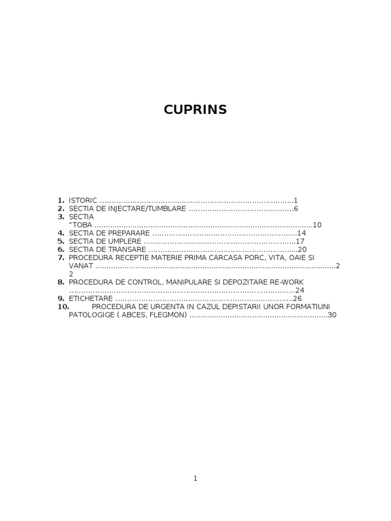 1. ISTORIC ..1 2. SECTIA DE INJECTARE/TUMBLARE 6 3. SECTIA TOBA ..................................................................................................10 4. SECTIA DE PREPARARE ..14 5. SECTIA DE UMPLERE ..17 6. SECTIA DE TRANSARE ....20 7. PROCEDURA RECEPTIE MATERIE PRIMA CARCASA PORC, VITA, OAIE SI VANAT ............................................................................................................2 2 8. PROCEDURA DE CONTROL, MANIPULARE SI DEPOZITARE RE-WORK .......24 9. ETICHETARE .26 10. PROCEDURA DE URGENTA IN CAZUL DEPISTARII UNOR FORMATIUNI PATOLOGIGE ( ABCES, FLEGMON) ..............................................................30