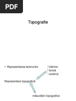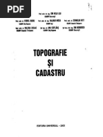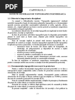 CAPITOLUL 1 MSURTORILE TERESTRE - NOIUNI GENERALE 1.1 Obiectul i ramurile msurtorilor terestre Topografia face parte dintr-un grup de tiine i tehnici numite la modul general msurtori terestre, care se ocup de studiul determinarea formelor i dimensiunilor Pmntului n ansamblul su, sau pe poriuni de teren precum i de reprezentarea acestora pe hri i planuri. Msurtorile terestre au evoluat alturi de alte tiine ca: matematica, fizica, astronomia, mecanica cereasc i electronica, care au permis dezvoltarea instrumentelor de msurare precum i a metodelor de prelucrare a msurtorilor. - Evoluia tiinific a matematicii a permis dezvoltarea metodelor de prelucrare i interpretare a rezultatelor msurtorilor; - Fizica i electronica au oferit deschideri noi n domeniul aparaturii utilizate la efectuarea msurtorilor. Msurtorile terestre au o importan deosebit att n dezvoltarea tiinific ct i n cea economic. Ramurile mari ale msurtorilor terestre sunt: geodezia; topografia; cadastrul; fotogrammetria; Geodezia este tiina care studiaz forma i dimensiunea Pmntului, cmpul gravitaional n sistem tridimensional, n funcie de timp. n 1880, Helmert definete geodezia ca fiind: tiina msurrii i reprezentrii Pmntului. n cadrul acesteia exist o serie de subramuri cum ar fi: astronomia geodezic, geodezia marin, geodezia inerial, geodezia diferenial. Topografia este acea tiin ce se ocup cu msurarea i reprezentarea suprafeelor relativ mici de teren, fr a ine seama de curbura Pmntului. Denumirea deriv din cuvintele greceti topos = loc i grapheim = a descrie. Prin msurtorile topografice se stabilesc poziiile relative dintre diverse obiecte din teren i reprezentarea acestora pe planuri i hri. Cadastrul este sistemul unitar i obligatoriu de eviden tehnic, economic i juridic, prin care se realizeaz identificarea, nregistrarea, descrierea i reprezentarea pe hri i planuri cadastrale a tuturor terenurilor, precum i a celorlalte bunuri imobile de pe ntreg teritoriul rii, indiferent de destinaia lor i de proprietar. Fotogrametria cuprinde procedee pentru determinarea i reprezentarea suprafeelor de teren pe baza unor fotografii speciale numite fotograme obinute prin fotografierea terenului din avioane echipate adecvat. Caracteristica principal a acestei ramuri este aceea c nu execut msurtori pe teren ci pe imaginea fotografic a acestuia. Fotogrametria nu se aplic independent de alte discipline la ntocmirea planurilor i hrilor, ci mpreun cu topografia, sprijinindu-se amndou pe reeaua geodezic. 1.2 Suprafee terestre Din punctul de vedere al msurtorilor terestre, se definesc urmtoarele trei suprafee (figura 1.1): suprafaa topografic; geoidul; elipsoidul.