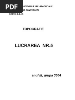 Se cere s se rezolve urmtoarele probleme: 1.S se reprezinte punctele pe format A4 la o scar aleas convenabil; 2.S se calculeze distanele D12, D23, D34, D41; 3.S se calculeze orientrile 12, 23, 34, 41. 4.S se reprezinte pe desen orientrile calculate; 5.S se reduc la scara 1 : 500 distana D12 i la scara 1 : 2000 distana D43; 6.S se calculeze coordonatele punctului 5 aflat la distana D45 = 22.26m i 45 = 123.3214. NTREBRI 1. Care este relaia de calcul numeric al scrii planurilor i hrilor? 2. Explicai semnificaia notaiilor din relaia de calcul numeric al scrii planurilor 3. Care este relaia de calcul a distanei din plan dintre 2 puncte n funcie de scara planului i distana din teren? 4. Care este relaia de calcul a distanei din teren dintre 2 puncte n funcie de scara planului i distana din plan? 5. Definii precizia grafic 6. Care sunt semnele convenionale pentru planimetrie? 7. Definii echidistana curbelor de nivel i valorile cele mai uzuale ale acestora 8. Cum se clasific curbele de nivel? 9. Ce reprezint caroiajul geografic? 10. Ce reprezint caroiajul rectangular?