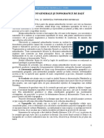 Figura 1.1 Suprafee terestre Suprafaa topografic este suprafaa terenului natural, cu toate caracteristicile lui, aa cum va fi reprezentat pe hri i planuri. Are forma neregulat i nu este geometrizat (nu are o form matematic ce poate fi descris prin relaii matematice). Geoidul este o suprafa echipotenial particular a cmpului gravitaional terestru, asimilat cu suprafaa linitit a mrilor i oceanelor considerat prelungit pe sub mri i oceane. Are o form uor ondulat, fiind denumit suprafaa de nivel zero i constituie originea n msurarea altitudinilor punctelor de pe suprafaa topografic a Pmntului. Are o form neregulat i nu este matematizat. Are proprietatea c n orice punct al su este perpendicular pe verticala VV, respectiv pe direcia acceleraiei gravitaionale, indicat de regul de firul cu plumb. Elipsoidul de revoluie este suprafaa geometric cea mai apropiat de geoid rezultat prin rotirea unei elipse n jurul axei mici 2b, iar axa mic este paralel cu axa globului terestru. De-a lungul timpului mai muli matematicieni i geodezi au calculat diveri elipsoizi n ncercarea de-a gsi parametrii optimi. La ora actual la noi n ar se folosete elipsoidul Krasovski care are urmtorii parametri: a = 6 378 245 m semiaxa mare b = 6 356 863 m semiaxa mic ab 1 f= = - turtirea a 298.3 Corespondena punctelor de pe suprafaa topografic pe elipsoid se face prin proiectarea punctului aflat pe suprafaa terestr pe elipsoid prin intermediul normalei NN la elipsoid, iar punctul capt coordonate geografice. Coordonatele geografice sunt latitudinea i longitudinea. Latitudinea BP este unghiul format de normala la elipsoid cu planul ecuatorului. Putem vorbi de latitudine nordic sau sudic n funcie de poziia punctului ntr-una din cele dou emisfere. Pe ecuator latitudinea este zero. Longitudinea LP este unghiul diedru dintre meridianul geodezic ce trece prin punct i meridianul de origine al elipsoidului de referin. Meridianul de origine zero este ales convenional cel ce trece prin observatorul astronomic de la Greenwich, de lng Londra. Sistemul de coordonate geografice are dou familii de linii de coordonate: Lat=const familia paralelelor Long=const familia meridianelor