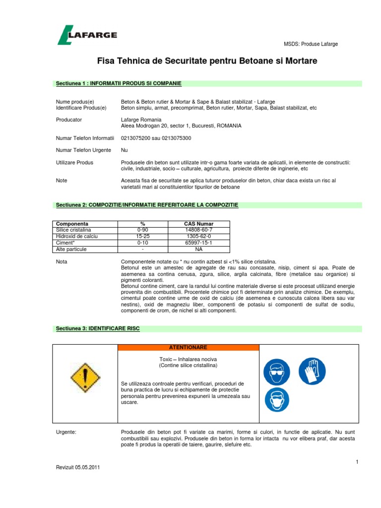 Beton & Beton rutier & Mortar & Sape & Balast stabilizat - Lafarge Beton simplu, armat, precomprimat, Beton rutier, Mortar, Sapa, Balast stabilizat, etc Lafarge Romania Aleea Modrogan 20, sector 1, Bucuresti, ROMANIA 0213075200 sau 0213075300 Nu Produsele din beton sunt utilizate intr-o gama foarte variata de aplicatii, in elemente de constructii: civile, industriale, socio culturale, agricultura, proiecte diferite de inginerie, etc Aceasta fisa de securitate se aplica tuturor produselor din beton, chiar daca exista un risc al varietatii mari al constituientilor tipurilor de betoane