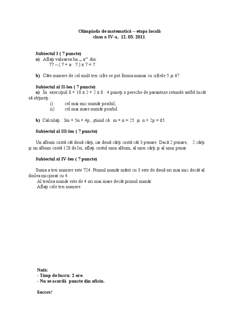. 2011 Subiectul I ( 7 puncte) a) Aflai valoarea lui ,, x din: 77 ( 7 + x : 7 ) x 7 = 7 b) Cte numere de cel mult trei cifre se pot forma numai cu cifrele 5 i 6? Subiectul al II-lea ( 7 puncte) a) n exerciiul 8 + 10 x 2 + 2 x 8 : 4 punei o pereche de paranteze rotunde astfel nct s obinei : i) cel mai mic numr posibil; ii) cel mai mare numr posibil. b) Calculai : 3m + 5n + 4p , tiind c : m + n = 25 i n + 2p = 65. Subiectul al III-lea ( 7 puncte) Un album cost ct dou cri, iar dou cri cost ct 3 penare. Dac 2 penare, i un album cost 128 de lei, aflai costul unui album, al unei cri i al unui penar. Subiectul al IV-lea ( 7 puncte) Suma a trei numere este 724. Primul numr mrit cu 3 este de dou ori mai mic dect al doilea micorat cu 4. Al treilea numr este de 4 ori mai mare dect primul numr. Aflai cele trei numere. 2 cri