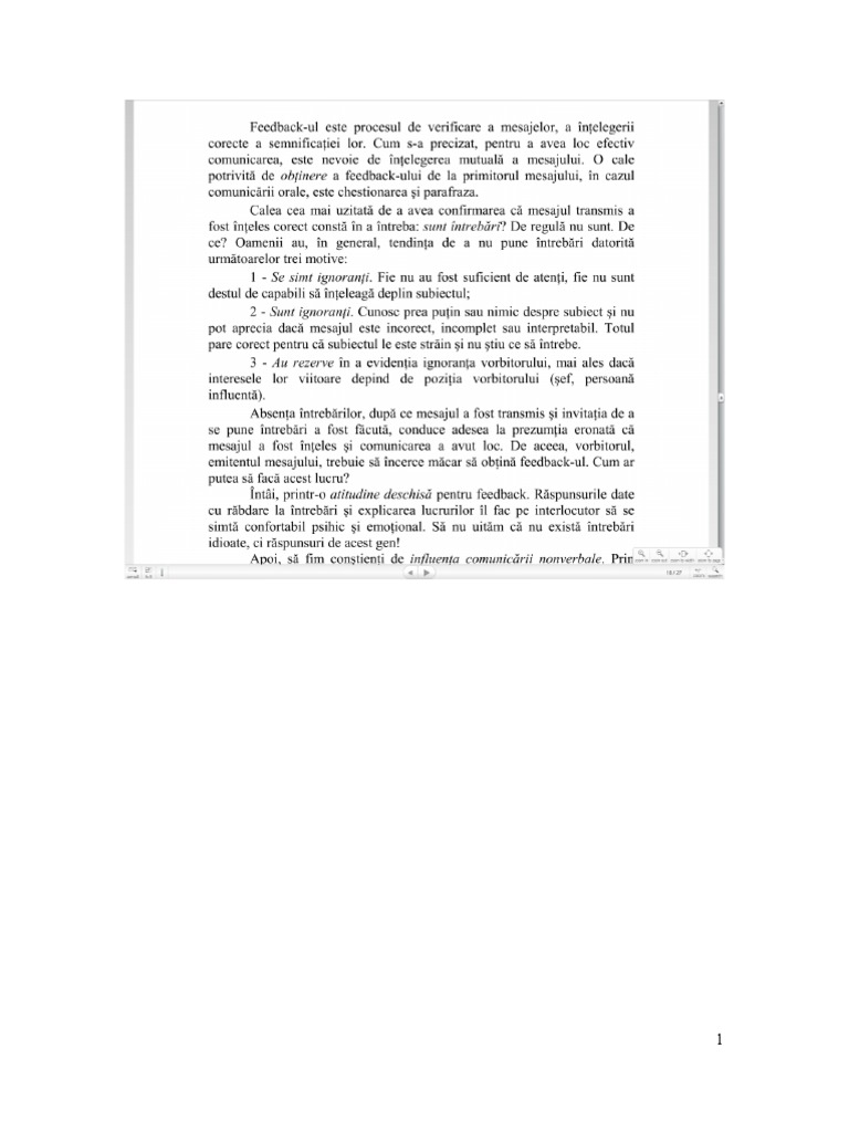 7. Este verificat pentru a asigura o comunicare clara. O modalitate de a realiza acest lucru consta n a-l determina pe receptor sa ncerce sa reformuleze feedbackul sub forma unei ntrebari pentru a verifica daca versiunea acestuia corespunde cu ceea ce a vrut sa spuna emitatorul; 8. Feedback-ul nu trebuie folosit pentru a te descarca pe cineva. Daca credeti ca trebuie sa spuneti ceva celuilalt ntrebati-va mai nti pe cine ncercati sa ajutati. FEEDBACK difera de SFAT Celor mai multi dintre noi le place sa dea sfaturi. Aceasta sugereaza ca suntem competenti si importanti. Ne lasam prea usor ademeniti de rolul de sfatuitor fara a verifica daca sfatul este potrivit problemei sau abilitatii, temerii sau calitatii persoanei pe care ncercam sa o ajutam. 9. Un feedback util are nevoie de urmatoarele: ncredere reciproca; receptarea feedback-ului ca o experienta comuna; ascultarea atenta, mai ales din partea emitatorului; comportamentul emitatorului sa fie de natura a-l ajuta pe receptor sa vorbeasca. Ce trebuie sa stiti cnd dati feedback fiti descriptivi: relatati n mod ct mai obiectiv posibil, ce ati vazut ca facea