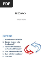 Definitie: Feedback nseamna a descrie altei persoane comportamentul acesteia si ceea ce ati simtit ca reactie la acest comportament. Feedback-ul este un mod de a ajuta pe cineva sa se gandeasca sa-si schimbe comportamentul, nseamna a furniza cuiva aspecte ale comportamentului sau si efectele acestuia asupra dumneavoastra. Ca ntrun sistem de rachete dirijate, feedback-ul ajuta individul sa afle daca comportamentul lui a avut efectul scontat; l informeaza daca nu a gresit tinta pe masura ce ncerca sa-si atinga obiectivele. Criterii pentru folosirea feedback-ului: 1. Este mai curnd descriptiv dect evaluativ. Este mai util sa va concentrati asupra a ceea ce a facut individul dect sa-i traduceti comportamentul ntr-o afirmatie despre ceea ce este individul respectiv;