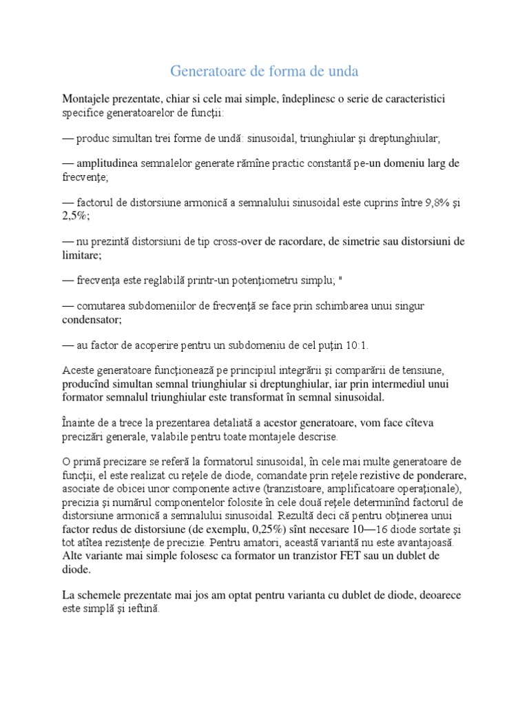 Montajele prezentate, chiar si cele mai simple, ndeplinesc o serie de caracteristici specifice generatoarelor de funcii: produc simultan trei forme de und: sinusoidal, triunghiular i dreptunghiular; amplitudinea semnalelor generate rmne practic constant pe-un domeniu larg de frecvene; factorul de distorsiune armonic a semnalului sinusoidal este cuprins ntre 9,8% i 2,5%; nu prezint distorsiuni de tip cross-over de racordare, de simetrie sau distorsiuni de limitare; frecvena este reglabil printr-un poteniometru simplu; " comutarea subdomeniilor de frecven se face prin schimbarea unui singur condensator; au factor de acoperire pentru un subdomeniu de cel puin 10:1. Aceste generatoare funcioneaz pe principiul integrrii i comparrii de tensiune, producnd simultan semnal triunghiular si dreptunghiular, iar prin intermediul unui formator semnalul triunghiular este transformat n semnal sinusoidal. nainte de a trece la prezentarea detaliat a acestor generatoare, vom face cteva precizri generale, valabile pentru toate montajele descrise. O prim precizare se refer la formatorul sinusoidal, n cele mai multe generatoare de funcii, el este realizat cu reele de diode, comandate prin reele rezistive de ponderare, asociate de obicei unor componente active (tranzistoare, amplificatoare operaionale), precizia i numrul componentelor folosite n cele dou reele determinnd factorul de distorsiune armonic a semnalului sinusoidal. Rezult deci c pentru obinerea unui factor redus de distorsiune (de exemplu, 0,25%) snt necesare 1016 diode sortate i tot attea rezistene de precizie. Pentru amatori, aceast variant nu este avantajoas. Alte variante mai simple folosesc ca formator un tranzistor FET sau un dublet de diode. La schemele prezentate mai jos am optat pentru varianta cu dublet de diode, deoarece este simpl i ieftin.