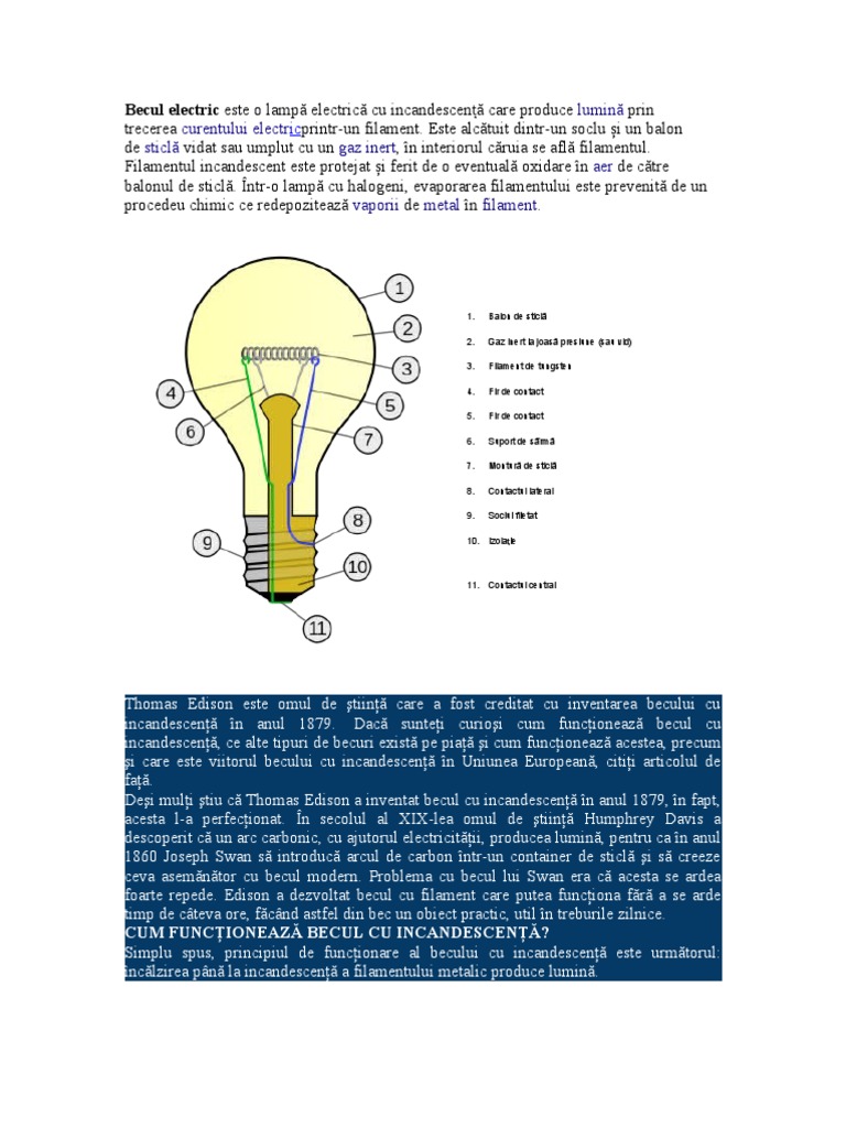 Thomas Edison este omul de tiin care a fost creditat cu inventarea becului cu incandescen n anul 1879. Dac suntei curioi cum funcioneaz becul cu incandescen, ce alte tipuri de becuri exist pe pia i cum funcioneaz acestea, precum i care este viitorul becului cu incandescen n Uniunea European, citii articolul de fa. Dei muli tiu c Thomas Edison a inventat becul cu incandescen n anul 1879, n fapt, acesta l-a perfecionat. n secolul al XIX-lea omul de tiin Humphrey Davis a descoperit c un arc carbonic, cu ajutorul electricitii, producea lumin, pentru ca n anul 1860 Joseph Swan s introduc arcul de carbon ntr-un container de sticl i s creeze ceva asemntor cu becul modern. Problema cu becul lui Swan era c acesta se ardea foarte repede. Edison a dezvoltat becul cu filament care putea funciona fr a se arde timp de cteva ore, fcnd astfel din bec un obiect practic, util n treburile zilnice. CUM FUNCIONEAZ BECUL CU INCANDESCEN? Simplu spus, principiul de funcionare al becului cu incandescen este urmtorul: nclzirea pn la incandescen a filamentului metalic produce lumin.
