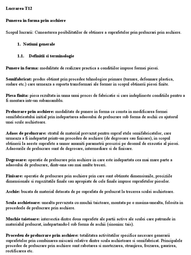 Punere in forma: modalitate de realizare practica a conditiilor impuse formei piesei. Semifabricat: produs obtinut prin procedee tehnologiee primare (turnare, defonnare plastica, sudare etc.) care urmeaza a suporta transformari ale former in scopul obtinerii piesei finite. Piesa finita: piesa rezultata in unna unui proces de fabricatie si care indeplineste conditiile pentru a fi montara intr-un subansamblu. Prelucrare prin aschiere: modalitate de punere in forma ce consta in modificarea formei semifabrieatului initial prin indepartarea adaosului de prelucrare sub forma de aschii cu ajutorul unei scule aschietoare. Adaos de prelucrare: stratul de material prevazut pentru supraf etele semifabricatelor, care urmeaza a fi indepartat printr-un procedeu de aschiere (de degrosare sau finisare), in scopul obtinerii la aeeste suprafete a unnor anumiti parametrii prescrisi pe desenul de executie al piesei. Adaosurile de prelucrare sunt de degrosare, intermediare si de finisare. Degrosare: operatie de prelucrare prin aschiere in care este indepartata cea mai mare parte a adaosului de prelucrare, dintr-una sau mai multe treceri. Finisare: operatie de prelucrare prin aschiere prin care sunt obtinute dimensiunile, preciziile dimensionale si rugozitatile finale sau apropiate de cele finale impuse suprafetelor pieselor. Aschie: bucata de material detasata de pe suprafata de prelucrat la trecerea sculei aschietoare. Scula aschietoare: unealta prevazuta cu muchii taictoare, montata pe o masina-unealta, folosita in procedeele de prelucrare prin aschiere. Muchie taietoare: intersectia dintre doua suprafete ale partii active ale sculei care patrunde in materialul prelucrat, indepartandu-l sub forma de aschii (sinonim: tais). Procedeu de prelucrare prin aschiere: totalitatea activitatilor specifice necesare generarii suprafetelor prin combinarea miscarii relative dintre scula aschietoare si semifabricat. Principalele procedee de prelucrare prin aschiere sunt rabotarea si mortezarea, strunjirea, frezarea, gaurirea, rectificarea etc.