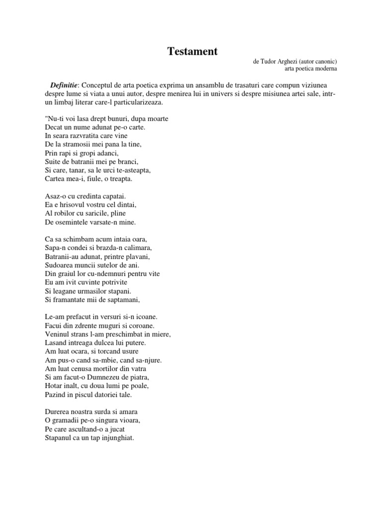 Din bube, mucegaiuri si noroi Iscat-am frumuseti si preturi noi. Biciul rabdat se-ntoarce in cuvinte Si izbaveste-ncet pedepsitor Odrasla vie-a crimei tuturor. E-ndreptatirea ramurei obscure Iesita la lumina din padure Si dand in varf ca un ciorchin de negi Rodul durerii de vecii intregi. Intinsa lenesa pe canapea, Domnita sufera in cartea mea. Slova de foe si slova faurita Imparechiate-n carte se marita, Ca fierul cald imbratisat in cleste, Robul a scris-o, Domnul o citeste, Far-a cunoaste ca-n adancul ei Zace mania bunilor mei." Poezia "Testament" de Tudor Arghezi (1880 - 1967), aflata in fruntea primului volum, "Cuvinte potrivite" (1927), reflecta lirismul subiectiv si constituie, poate, cea mai cunoscuta arta poetica din lirica romaneasca. Alte poezii programatice sunt "Portret", "Ruga de seam", "Ia aminte". Tema poeziei "Testament" exprima conceptia despre arta a lui Arghezi si defineste programatic intreaga creatie lirica a poetului, in care cuvantul este atotputernic, stapan absolut al universului, iar opera literara este rodul harului divin si al trudei. Titlul "Testament" este sugestiv pentru ideea fundamentala a poeziei, aceea a relatiei spirituale dintre generatii si a responsabilitatii urmasilor fata de mesajul primit de la strabuni. De asemenea, titlul ilustreaza si in sens propriu faptul ca poezia este un "act oficial" intocmit de poet, prin care lasa mostenire urmasilor opera sa literara: "Nu-ti voi lasa drept bunuri dupa moarte, Decat un nume adunat pe-o carte." Structura, compozitie, limbaj poetic Incipitul este o adresare directa, forma negativa a verbului la persoana a II-a singular avand rolul de a accentua valoarea deosebita a mostenirii, opera literara, bunul cel mai de pret al poetului, pe care acesta o lasa prin testament viitorimii: "Nu-ti voi lasa drept bunuri dupa moarte, /Decat un nume adunat pe-o carte." Creatia literara constituie o acumulare spirituals mostenita "de la strabunii mei", realizata cu mult efort si in mod evolutiv: "Prin rapi si gropi adanci,/ Suite de batranii mei pe branci" Continuarea traditiei stravechi si a operei infaptuite de stramosi constituie o treapta in evolutia spirituaia a omenirii, simbolizata aici prin vocativul "fiule", o adresare directa, care da poeziei un ton familiar, intim, ce apropie predecesorii de viitorime: "si care, tanar, sa le urci te-asteapta,/ Cartea mea-i, fiule, o treapta." Ca mesager al trudei si durerii strabunilor, poetul asaza "cartea" la capataiul civilizatiei omenesti, cu indemnul, din nou adresat direct, de a respecta acest bun spiritual si a-l duce spre