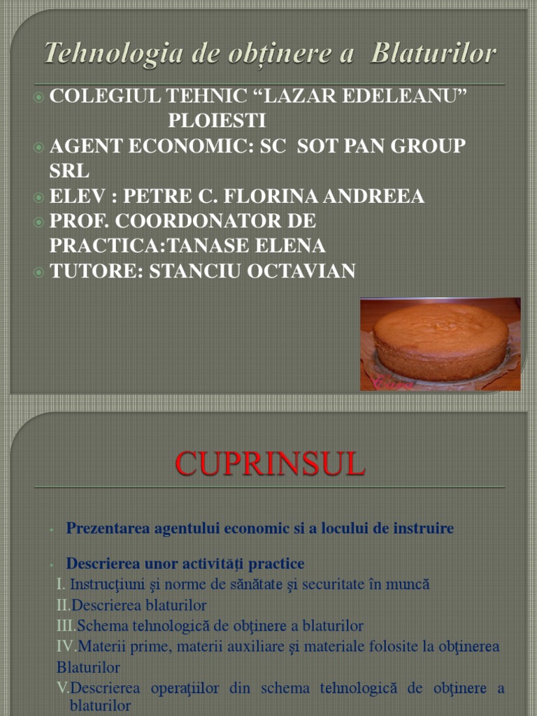 Descrierea unor activiti practice I. Instruciuni i norme de sntate i securitate n munc [Link] blaturilor [Link] tehnologic de obinere a blaturilor [Link] prime, materii auxiliare i materiale folosite la obinerea Blaturilor [Link] operaiilor din schema tehnologic de obinere a blaturilor VIProduse obinute Concluzii