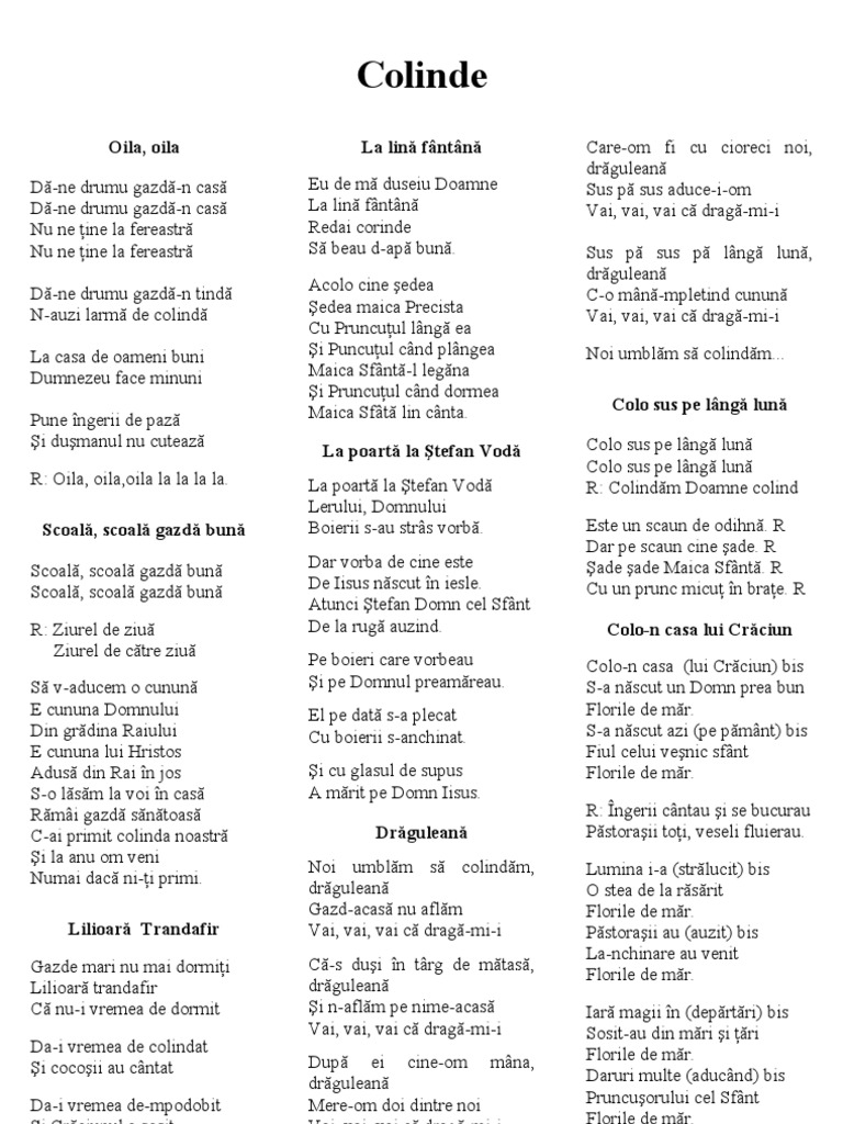 Oila, oila D-ne drumu gazd-n cas D-ne drumu gazd-n cas Nu ne ine la fereastr Nu ne ine la fereastr D-ne drumu gazd-n tind N-auzi larm de colind La casa de oameni buni Dumnezeu face minuni Pune ngerii de paz i dumanul nu cuteaz R: Oila, oila,oila la la la la. Scoal, scoal gazd bun Scoal, scoal gazd bun Scoal, scoal gazd bun R: Ziurel de ziu Ziurel de ctre ziu S v-aducem o cunun E cununa Domnului Din grdina Raiului E cununa lui Hristos Adus din Rai n jos S-o lsm la voi n cas Rmi gazd sntoas C-ai primit colinda noastr i la anu om veni Numai dac ni-i primi. Lilioar Trandafir Gazde mari nu mai dormii Lilioar trandafir C nu-i vremea de dormit Da-i vremea de colindat i cocoii au cntat Da-i vremea de-mpodobit i Crciunul a sosit. La lin fntn Eu de m duseiu Doamne La lin fntn Redai corinde S beau d-ap bun. Acolo cine edea edea maica Precista Cu Pruncuul lng ea i Puncuul cnd plngea Maica Sfnt-l legna i Pruncuul cnd dormea Maica Sft lin cnta. La poart la tefan Vod La poart la tefan Vod Lerului, Domnului Boierii s-au strs vorb. Dar vorba de cine este De Iisus nscut n iesle. Atunci tefan Domn cel Sfnt De la rug auzind. Pe boieri care vorbeau i pe Domnul preamreau. El pe dat s-a plecat Cu boierii s-anchinat. i cu glasul de supus A mrit pe Domn Iisus. Drgulean Noi umblm s colindm, drgulean Gazd-acas nu aflm Vai, vai, vai c drag-mi-i C-s dui n trg de mtas, drgulean i n-aflm pe nime-acas Vai, vai, vai c drag-mi-i Dup ei cine-om mna, drgulean Mere-om doi dintre noi Vai, vai, vai c drag-mi-i Care-om fi cu cioreci noi, drgulean Sus p sus aduce-i-om Vai, vai, vai c drag-mi-i Sus p sus p lng lun, drgulean C-o mn-mpletind cunun Vai, vai, vai c drag-mi-i Noi umblm s colindm... Colo sus pe lng lun Colo sus pe lng lun Colo sus pe lng lun R: Colindm Doamne colind Este un scaun de odihn. R Dar pe scaun cine ade. R ade ade Maica Sfnt. R Cu un prunc micu n brae. R Colo-n casa lui Crciun Colo-n casa (lui Crciun) bis S-a nscut un Domn prea bun Florile de mr. S-a nscut azi (pe pmnt) bis Fiul celui venic sfnt Florile de mr. R: ngerii cntau i se bucurau Pstoraii toi, veseli fluierau. Lumina i-a (strlucit) bis O stea de la rsrit Florile de mr. Pstoraii au (auzit) bis La-nchinare au venit Florile de mr. Iar magii n (deprtri) bis Sosit-au din mri i ri Florile de mr. Daruri multe (aducnd) bis Pruncuorului cel Sfnt Florile de mr.