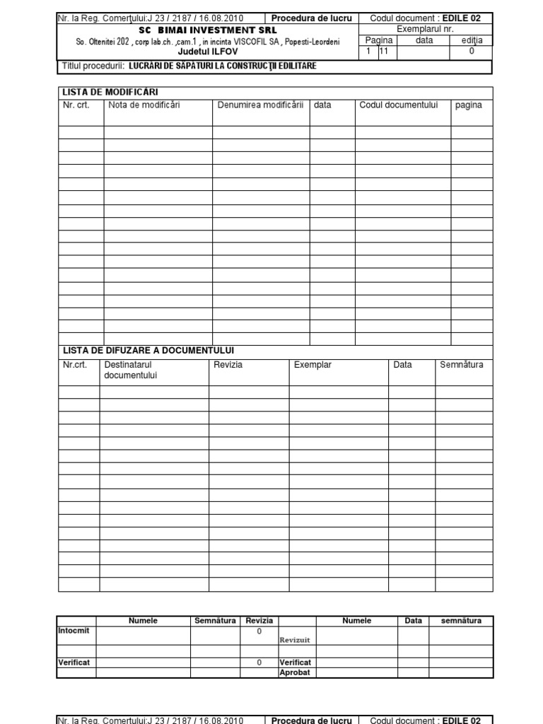 Procedura de lucru Nr. la Reg. Comerului:J 23 / 2187 / 16.08.2010 SC BIMAI INVESTMENT SRL So. Oltenitei 202 , corp [Link]. ,cam.1 , in incinta VISCOFIL SA , Popesti-Leordeni Judetul ILFOV Titlul procedurii: LUCRRI DE SPTURI LA CONSTRUCII EDILITARE