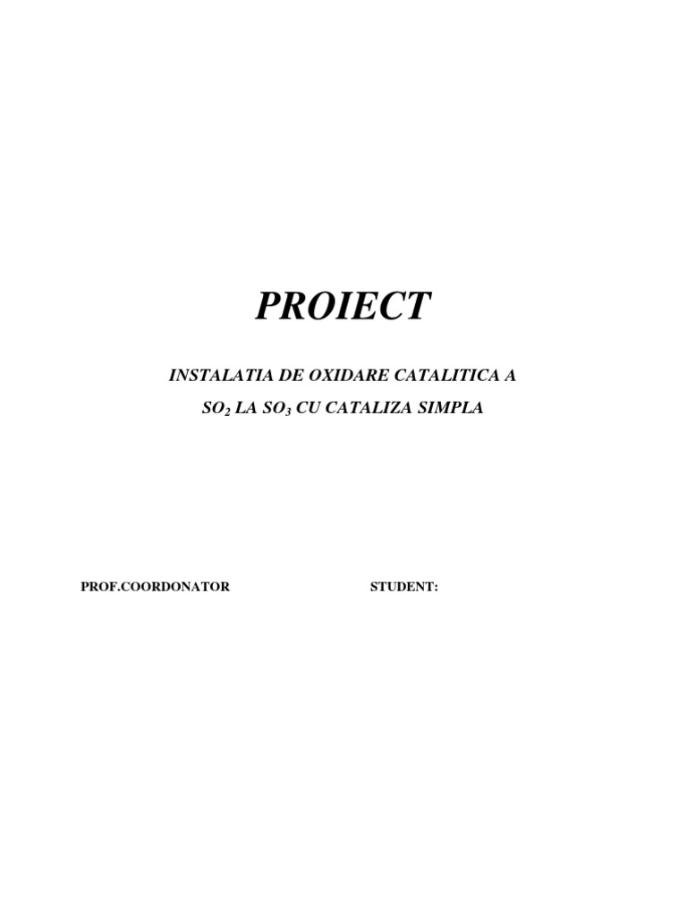 CUPRINS Cap1. Tema de proiectare 1.1 Prezentarea temei 1.2 Schema bloc si modul de operare 1.3 Utilaj ce urmaza a fi proiectat Cap 2. Procese tehnologice de fabricatie. Descrierea procesului adoptat 2.1 Variante de realizare a procesului tehnologic 2.1.1 Instalatia de cataliza simpla pentru oxidarea gazelor sulfuroase 2.1.2 Instalatia cu cataliza dubla pentru oxidarea gazelor sulfuroase de la arderea sulfului 2.2 Justificarea variantei tehnologice adoptate 2.3 Schema procesului tehnologic. Descriere Cap [Link] tehnologica a utilajelor 3.1 Dimensionarea reactorului de conversie catalitica a SO2 la SO3 3.1.1 Alegerea tipului de reactor 3.1.2 Materiale de constructie 3.1.3 Caracteristicile catalizatorului utilizat 3.1.4 Bilanturi de material 3.1.5 Echilibrul termodinamic 3.1.6 Determinarea parametrilor functionali ai reactorului. calculul regimului termic optim 3.1.7 Determinarea regimului optim de lucru al reactorului [Link] Modelul matematic al procesului [Link] Calculul parametrilor constructive ai reactorului. Determinarea timpilor de contact [Link] Calculul volumului de catalizator [Link] Calculul volumului de catalizator 3.2 Dimensionarea ventilatorului 3.2.1 Alegerea tipului de ventilator 3.2.2 Alegerea materialului de constructive [Link] de masura, control si automatizare 4.1 Aparate de masura, reglare si inregistrare