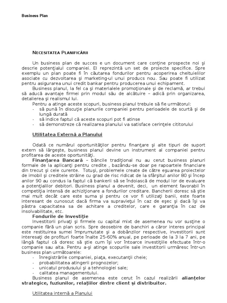 NECESITATEA PLANIFICRII Un business plan de succes e un document care conine prospecte noi i descrie potenialul companiei. El reprezint un set de proiecte specifice. Spre exemplu un plan poate fi n cutarea fondurilor pentru acoperirea cheltuielilor asociate cu dezvoltarea i marketing-ul unui producs nou. Sau poate fi utilizat pentru asigurarea unui credit bankar pentru producerea unui echipament. Business planul, la fel ca i materialele promoionale i de reclam, ar trebui s aduc avantaje firmei prin modul su de alctuire adic prin organizarea, detalierea i realismul lui. Pentru a atinge aceste scopuri, business planul trebuie s fie urmtorul: - s pun n discuie planurile companiei pentru perioadele de scurt i de lung durat - s indice faptul c aceste scopuri pot fi atinse - s demonstreze c realizarea planului va satisface cerinele cititorului Utilitatea Extern a Planului Odat ce numrul oportunitilor pentru finanare i alte tipuri de suport extern s lrgete, business planul devine un instrument al companiei pentru profitarea de aceste oportuniti. Finanarea Bancar bncile tradiional nu au cerut business planuri formale de la aplicani pentru credite , bazndu-se doar pe rapoartele financiare din trecut i cele curente. Totui, problemele create de ctre euarea proiectelor de imobil i creditele strine cu grad de risc ridicat de la sfritul anilor 80 i ncep anilor 90 au condus la faptul c bankerii s se ndoiasc de modul lor de evaluare a potenialilor debitori. Business planul a devenit, deci, un element favorabil n competiia intens de achiziionare a fondurilor creditare. Bancherii doresc s tie mai mult dect care este suma i pentru ce vor fi utilizai banii, este foarte interesant de cunoscut dac firma va supravieui n caz de eec i dac i va pstra capacitatea sa de achitare a creditelor, care e garania n caz de insolvabilitate, etc. Fondurile de Investiie Investitorii privai i firmele cu capital mixt de asemenea nu vor susine o companie fr un plan scris. Spre deosebire de banchiri a cror interes principal este restituirea sumei mprumutate i a dobnzilor respective, investitorii sunt interesai de profituri foarte nalte 25-60% anual, pe perioade de la 3 la 7 ani, pe lng faptul c doresc s tie cum i vor ntoarce investiiile efectuate ntr-o companie sau alta. Pentru a-i atinge scopurile sale investitorii urmresc ntr-un business plan urmtoarele: - nregistrrile companiei, piaa, executanii cheie; - probabilitatea atingerii prognozelor; - unicatul produsului i a tehnologiei sale; - calitatea managementului. Business planul de asemenea este cerut n cazul realizrii alianelor strategice, fuziunilor, relaiilor dintre client i distribuitor. Utilitatea intern a Planului