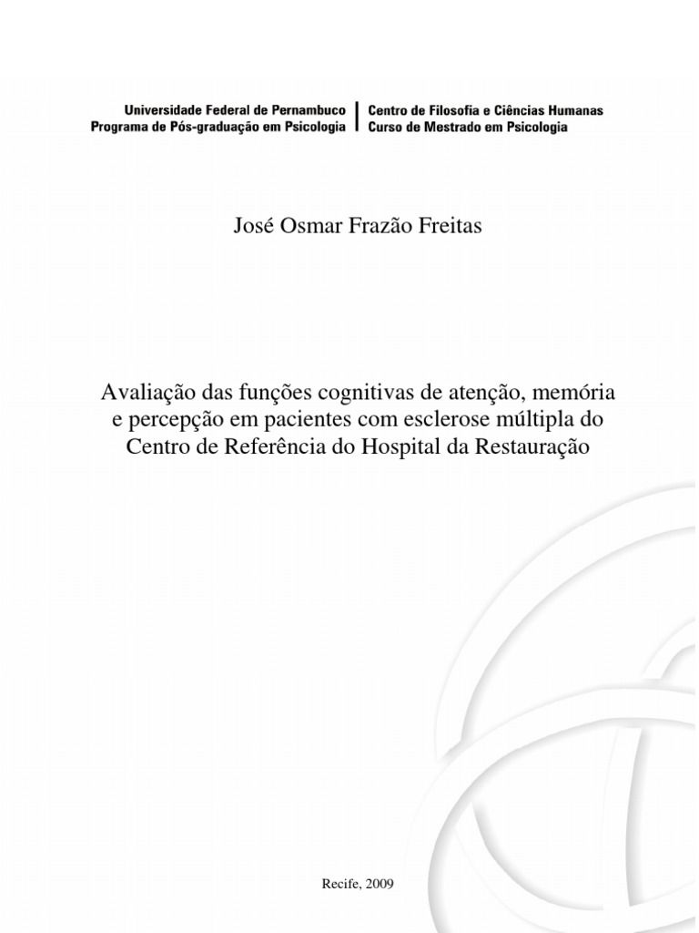 Freitas, José Osmar Frazão Avaliação das funções cognitivas de atenção, memória e percepção em pacientes com esclerose múltipla do centro de referência do Hospital da Restauração / José Osmar Frazão Freitas. - Recife: O Autor, 2009. 110 folhas : il., graf., tab., fig.