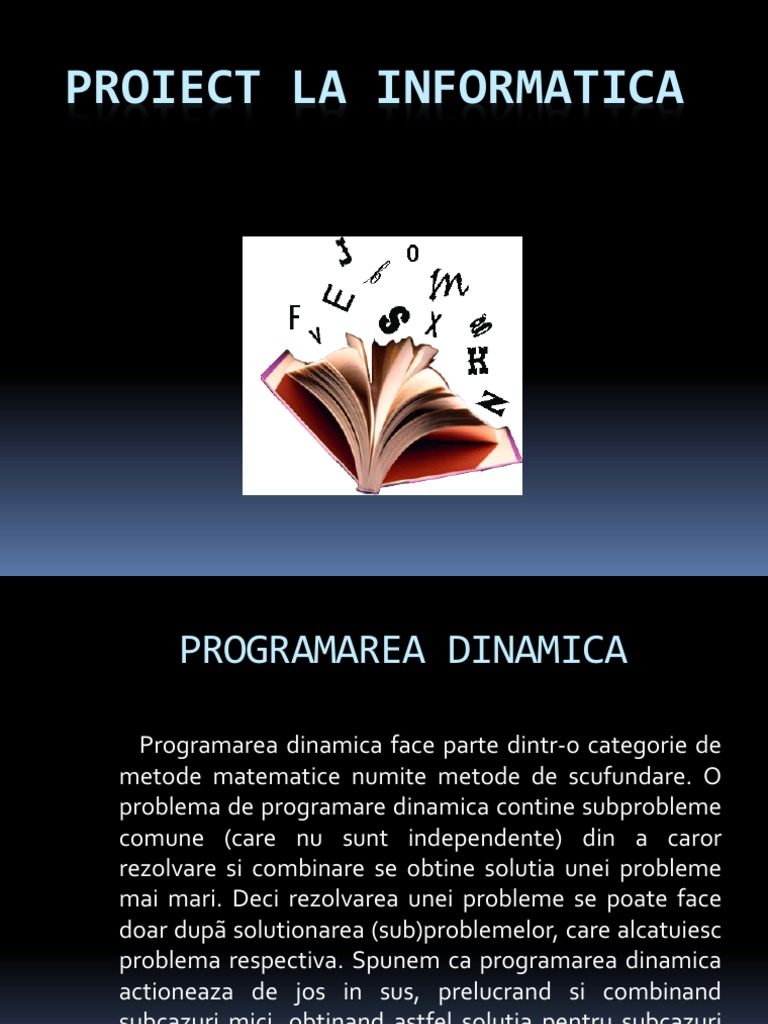 Programarea dinamica face parte dintr-o categorie de metode matematice numite metode de scufundare. O problema de programare dinamica contine subprobleme comune (care nu sunt independente) din a caror rezolvare si combinare se obtine solutia unei probleme mai mari. Deci rezolvarea unei probleme se poate face doar dup solutionarea (sub)problemelor, care alcatuiesc problema respectiva. Spunem ca programarea dinamica actioneaza de jos in sus, prelucrand si combinand subcazuri mici, obtinand astfel solutia pentru subcazuri tot mai mari.