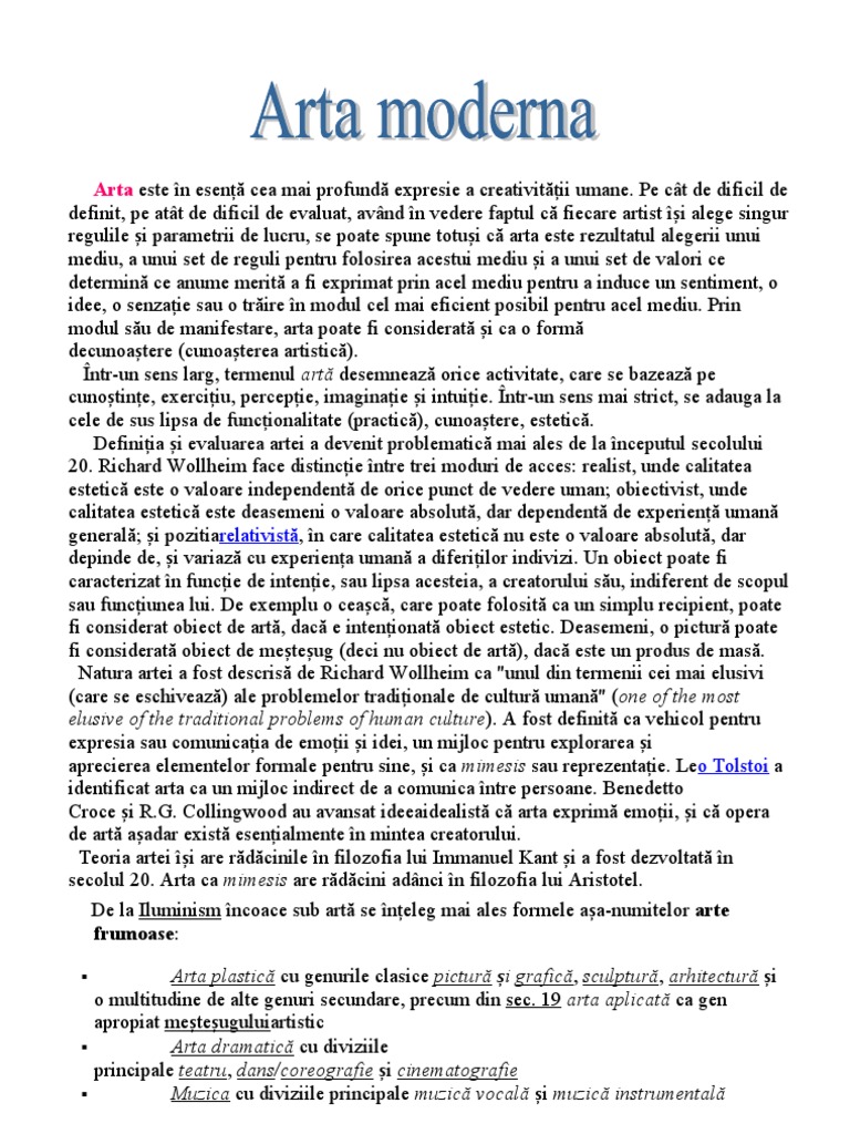 vizuale, arhitectura, muzica i literatura progresiv care s-a conturat n circa trei decenii nainte de anii 1910 - 1914, cnd artitii s-au revoltat mpotriva tradiiilor academice i istorice impuse i considerate standard ale secolelor anterioare, ncepnd cu cele ale secolului al XIV-lea i culminnd cu rigiditatea i "osificarea" academismului secolului al 19-lea. Unii istorici ai artei mpart secolul al XX-lea n perioada modern i cea postmodern, pe cnd alii le vd ca dou perioade ale aceleiai ere artistice. Prezentul articol prezint micarea care a nceput la finele secolului al XIX-lea; Modernitii au crezut c prin refuzarea tradiiei ar fi putut descoperi noi i radicale feluri de a crea "un altfel de art". Arnold Schoenberg a crezut n ignorarea armoniei tonale, tradiionale sistemul ierarhic de organizare a muzicii care a ghidat acest domeniu pentru mai bine de dou secole i jumtate ntruct a descoperit un mod nou de a organiza sunetul, bazat pe gruparea notelor n rnduri de cte dousprezece. Aceast tehnic a rezultat n creerea muzicii seriale a perioadei de dup primul rzboi mondial. Artitii abstraci, inspirai de micarea impresionist i de lucrrile lui Paul Czanne i Edvard Munch, au pornit conceptual de la presupunerea c att culoarea ct i forma - nu reprezentarea lumii naturale - sunt elementele eseniale ale artei vizuale. Astfel, Wassily Kandinsky, Piet Mondrian i Kazimir Malevich au ncercat s redefineasc arta ca i aranjamentul culorii pure. Dezvoltarea fotografiei a afectat puternic acest aspect al modernismului, fiindc nu mai era nevoie de funcia pur descriptiv ale niciuneia din artele vizuale. Aceti artiti moderniti au crezut cu trie c prin refuzarea reprezentrilor reale i materiale, arta va trece de faza materialist i va intra ntr-una spiritual. Postmodernismul este termenul de referin aplicat unei vaste game de evoluii n domeniile de teorie critic, filosofie, arhitectur, art, literatur i cultur. Diversele expresii ale postmodernismului provin, depesc sau sunt o reacie a modernismului. Dac modernismul se consider pe sine o culminare a cutrii unei estetici a iluminismului, o etic, postmodernismul se ocup de modul n care autoritatea unor entiti ideale (numitemetanaraiuni) este slbit prin procesul de fragmentare, consumism i deconstrucie. Jean-Franois Lyotard a descris acest curent drept o nencredere n metanaraiuni (Lyotard, 1984); n viziunea acestuia, postmodernismul