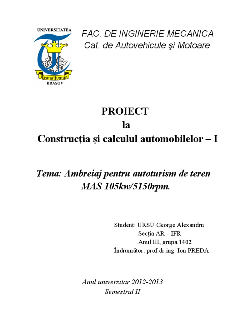 1 Cuprins..........................................................................................................................2 2 STUDIU DE NIVEL AL AMBREIAJELOR ..............................................................3 2.1 Funciunile ambreiajului......................................................................................4 2.1.1 Conditiile impuse ambreiajului...................................................................4 2.2 Soluii constructive...............................................................................................4 2.3 SolutiI constructive de viitor................................................................................18 2.4 Solutia constructiva aleasa...................................................................................20 2.5 Operaii de ntreinere...........................................................................................21 3 MATERIALE UTILIZATE LA CONSTRUCIA ambreiajului.................................22 4 MODALITI DE DETERIORARE A ambreiajului.................................................23 5 JUSTIFICAREA SOLUIEI CONSTRUCTIVE ALESE I CALCULUL ambreiajului 25 5.1 Justificarea Soluiei Constructive.........................................................................25 5.2 Alegerea Regimurilor de Calcul...........................................................................25 5.3 calculul ambreiajului............................................................................................26 5.4 Concluzie Privind Calculul..................................................................................29 6 IDENTIFICAREA UNEI MODALITI DE CRETERE A CALITII ambreiajului 30 7 IDENTIFICAREA UNEI MODALITI DE REDUCERE A COSTULUI ambreiajului.....................................................................................................................31 8 CONCLUZII.................................................................................................................32 8.1 Probleme i Dificulti ntmpinate i Rezolvate.................................................32 8.2 Aspecte Originale ale Soluiei Constructive........................................................32 8.3 Comparaie cu Alte Produse Similare..................................................................32 8.4 Cteva Lucruri nvate prin Realizarea Proiectului............................................32 9 BIBLIOGRAFIE...........................................................................................................33 10 ANEXE.......................................................................................................................34 10.1 Plane.................................................................................................................34 10.1.1 Schema cinematic...................................................................................34 10.1.2 Desen de ansamblu...................................................................................34 10.1.3 Desen de execuie....................................................................................34