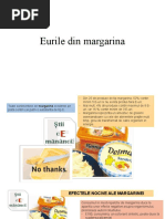 margarin, dar de fapt a achiziionat o cutie cu ap, cteva picturi de ulei i prafuri care s i dea consistena unei margarine. i ca totul s fie ct mai veridic, s-au folosit colorani alimentari, astfel nct produsul s semene ct mai mult cu untul. Mirosul este i el gdilat de prezena aromelor naturale. In compozitia margarinei intra si doua vitamine:A si D3. Vitaminele sintetice nu sunt asimilate de organism,iar in acest context valoarea lor este 0. MARGARINA DELMA MULTIVITA (CU 8 VITAMINE)