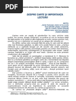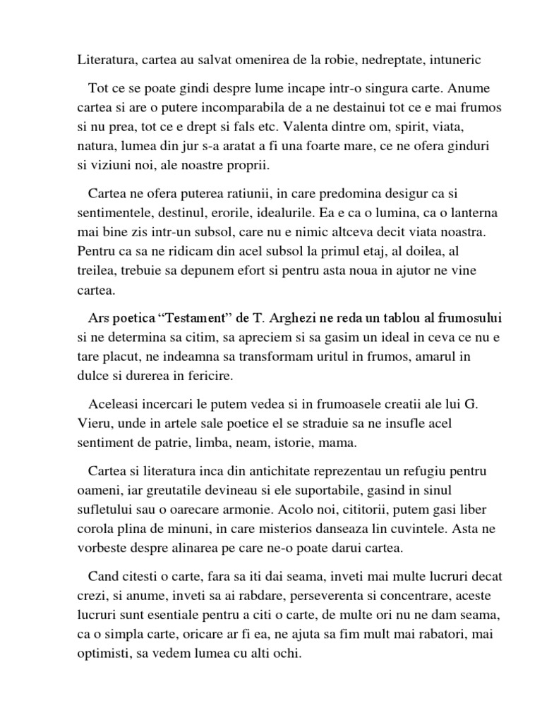 carte. Anume cartea si are o putere incomparabila de a ne destainui tot ce e mai frumos si nu prea, tot ce e drept si fals etc. Valenta dintre om, spirit, viata, natura, lumea din jur s-a aratat a fi una foarte mare, ce ne ofera ginduri si viziuni noi, ale noastre proprii. Cartea ne ofera puterea ratiunii, in care predomina desigur ca si sentimentele, destinul, erorile, idealurile. Ea e ca o lumina, ca o lanterna mai bine zis intr-un subsol, care nu e nimic altceva decit viata noastra. Pentru ca sa ne ridicam din acel subsol la primul etaj, al doilea, al treilea, trebuie sa depunem efort si pentru asta noua in ajutor ne vine cartea. Ars poetica Testament de T. Arghezi ne reda un tablou al frumosului si ne determina sa citim, sa apreciem si sa gasim un ideal in ceva ce nu e tare placut, ne indeamna sa transformam uritul in frumos, amarul in dulce si durerea in fericire. Aceleasi incercari le putem vedea si in frumoasele creatii ale lui G. Vieru, unde in artele sale poetice el se straduie sa ne insufle acel sentiment de patrie, limba, neam, istorie, mama. Cartea si literatura inca din antichitate reprezentau un refugiu pentru oameni, iar greutatile devineau si ele suportabile, gasind in sinul sufletului sau o oarecare armonie. Acolo noi, cititorii, putem gasi liber corola plina de minuni, in care misterios danseaza lin cuvintele. Asta ne vorbeste despre alinarea pe care ne-o poate darui cartea. Cand citesti o carte, fara sa iti dai seama, inveti mai multe lucruri decat crezi, si anume, inveti sa ai rabdare, perseverenta si concentrare, aceste lucruri sunt esentiale pentru a citi o carte, de multe ori nu ne dam seama, ca o simpla carte, oricare ar fi ea, ne ajuta sa fim mult mai rabatori, mai optimisti, sa vedem lumea cu alti ochi.