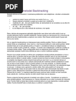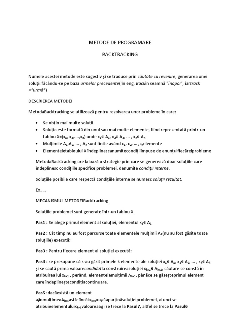 Numele acestei metode este sugestiv i se traduce prin cutate cu revenire, generarea unei soluii fcndu-se pe baza urmelor precedente( n eng. Backn seamn napoi, iartrack =urm) DESCRIEREA METODEI MetodaBacktracking se utilizeaz pentru rezolvarea unor probleme n care: Se obin mai multe soluii Soluia este format din unul sau mai multe elemente, fiind reprezentat printr -un tablou X=(x1, x2,....,xn) unde x1 A1, x2 A2, ... , xn An Mulimile A1,A2, ... , An sunt finite avnd c1, c2, ,cnelemente Elementeletabloului X ndeplinescanumitecondiiiimpuse de enunulfiecreiprobleme