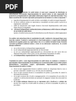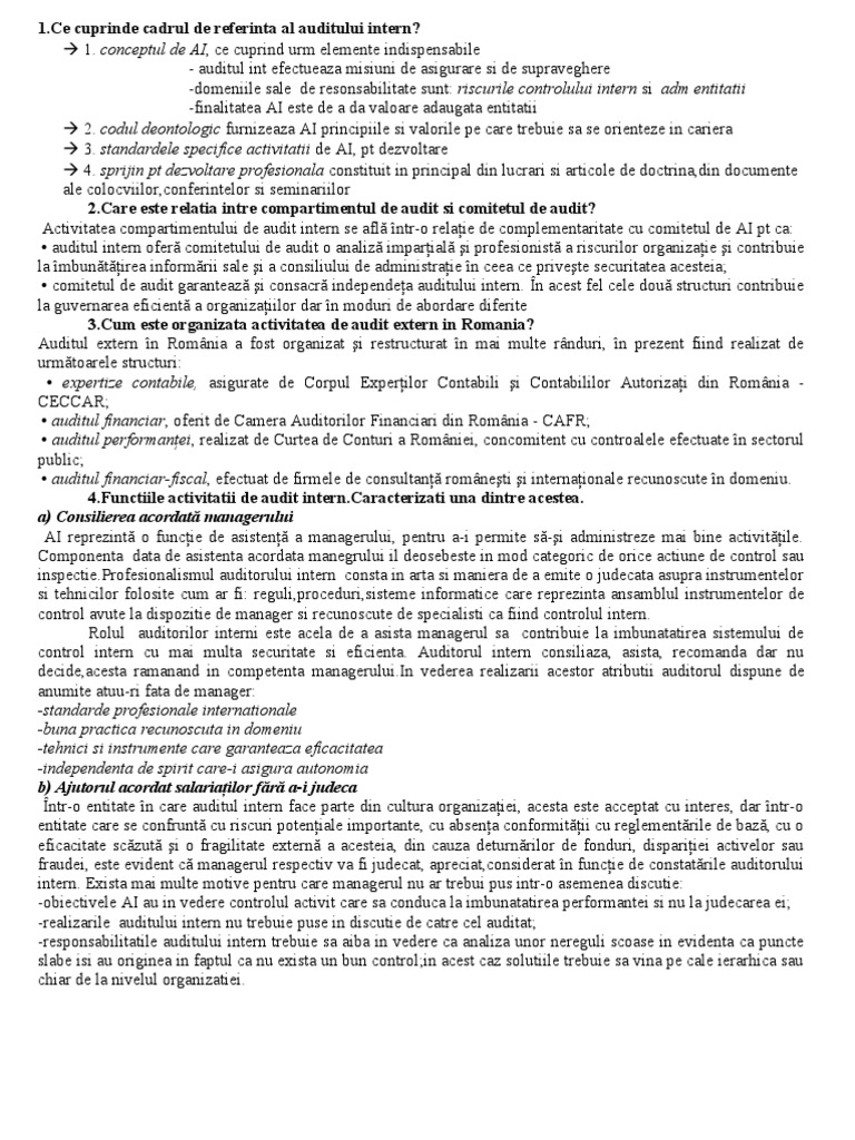 . conceptul de AI, ce cuprind urm elemente indispensabile - auditul int efectueaza misiuni de asigurare si de supraveghere -domeniile sale de resonsabilitate sunt: riscurile controlului intern si adm entitatii -finalitatea AI este de a da valoare adaugata entitatii 2. codul deontologic furnizeaza AI principiile si valorile pe care trebuie sa se orienteze in cariera 3. standardele specifice activitatii de AI, pt dezvoltare 4. sprijin pt dezvoltare profesionala constituit in principal din lucrari si articole de doctrina,din documente ale colocviilor,conferintelor si seminariilor [Link] este relatia intre compartimentul de audit si comitetul de audit? Activitatea compartimentului de audit intern se afl ntr-o relaie de complementaritate cu comitetul de AI pt ca: auditul intern ofer comitetului de audit o analiz imparial i profesionist a riscurilor organizaie i contribuie la mbuntirea informrii sale i a consiliului de administraie n ceea ce privete securitatea acesteia; comitetul de audit garanteaz i consacr independea auditului intern. n acest fel cele dou structuri contribuie la guvernarea eficient a organizaiilor dar n moduri de abordare diferite [Link] este organizata activitatea de audit extern in Romania? Auditul extern n Romnia a fost organizat i restructurat n mai multe rnduri, n prezent fiind realizat de urmtoarele structuri: expertize contabile, asigurate de Corpul Experilor Contabili i Contabililor Autorizai din Romnia CECCAR; auditul financiar, oferit de Camera Auditorilor Financiari din Romnia - CAFR; auditul performanei, realizat de Curtea de Conturi a Romniei, concomitent cu controalele efectuate n sectorul public; auditul financiar-fiscal, efectuat de firmele de consultan romneti i internaionale recunoscute n domeniu. [Link] activitatii de audit [Link] una dintre acestea. a) Consilierea acordat managerului AI reprezint o funcie de asisten a managerului, pentru a-i permite s-i administreze mai bine activitile. Componenta data de asistenta acordata manegrului il deosebeste in mod categoric de orice actiune de control sau [Link] auditorului intern consta in arta si maniera de a emite o judecata asupra instrumentelor si tehnicilor folosite cum ar fi: reguli,proceduri,sisteme informatice care reprezinta ansamblul instrumentelor de control avute la dispozitie de manager si recunoscute de specialisti ca fiind controlul intern. Rolul auditorilor interni este acela de a asista managerul sa contribuie la imbunatatirea sistemului de control intern cu mai multa securitate si eficienta. Auditorul intern consiliaza, asista, recomanda dar nu decide,acesta ramanand in competenta [Link] vederea realizarii acestor atributii auditorul dispune de anumite atuu-ri fata de manager: -standarde profesionale internationale -buna practica recunoscuta in domeniu -tehnici si instrumente care garanteaza eficacitatea -independenta de spirit care-i asigura autonomia b) Ajutorul acordat salariailor fr a-i judeca ntr-o entitate n care auditul intern face parte din cultura organizaiei, acesta este acceptat cu interes, dar ntr-o entitate care se confrunt cu riscuri poteniale importante, cu absena conformitii cu reglementrile de baz, cu o eficacitate sczut i o fragilitate extern a acesteia, din cauza deturnrilor de fonduri, dispariiei activelor sau fraudei, este evident c managerul respectiv va fi judecat, apreciat,considerat n funcie de constatrile auditorului intern. Exista mai multe motive pentru care managerul nu ar trebui pus intr-o asemenea discutie: -obiectivele AI au in vedere controlul activit care sa conduca la imbunatatirea performantei si nu la judecarea ei; -realizarile auditului intern nu trebuie puse in discutie de catre cel auditat; -responsabilitatile auditului intern trebuie sa aiba in vedere ca analiza unor nereguli scoase in evidenta ca puncte slabe isi au originea in faptul ca nu exista un bun control;in acest caz solutiile trebuie sa vina pe cale ierarhica sau chiar de la nivelul organizatiei.