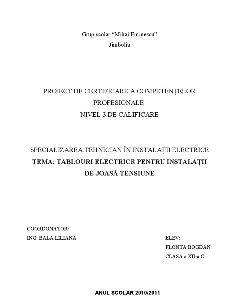 -justificarea inportanteiinstalatiilorvelectrice de joasa tensiune si medie tensiune; -dezvoltarea deprinderilor de exploatare si de intretinere a instalatiilor electrice de joasa tensiune su medie tensiune; -dobandirea unui sistem logic structurat si coerent de cunostinte privind instalatiile electrice de joasa tensiune si medie tensiune. Proietul constituie o verificare a cunostintelor, priceperilor si deprinderilor necesare in constructia, elaborarea, intretinerilor si repararea instalatiilor electrice de joasa tensiune si medie [Link] asemenea continuturile incluse in proiect vor permite dezvoltarea unor abilitati practice si creative privind identificarea elementelor constructive ale instalatiilor electrice de joasa tensiune si medie tensiune. Solutiile proiectului pentru rezolvarea problemelor practice au o buna transferabilitate in alte contexte practice. Elaborarea proiectului se justifica prin multiplele legaturi functionale dintre elementele de circuit ale instalatiilor electrice si celelalte componente ale acestora. Proiectul contine cunostinte de baza cu privire la defectiunile posibile ale instalatiilor electrice de joasa tensiune cat si tehnicile si tehnologiile de reparare ale acestora. Proiectul a avut in vedere cadrul de parteneriat intre scoala si comunitate si tine cont de resursele locale pentru instruire (baza materiala a scolii, cadrul de colaborare cu agentii economici) si cerintele locale pentru pregatirea in calificarea de electrician exploatarea medie si joasa tensiune, care sa serveasca activitatiilor economice desfasurate in zona. Prin elaborarea si sustinerea proiectului elevul obtine certificatul de calificare profesionala nivelul 3.