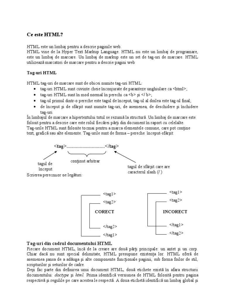 HTML este un limbaj pentru a descrie paginile web. HTML vine de la Hyper Text Markup Language. HTML nu este un limbaj de programare, este un limbaj de marcare. Un limbaj de markup este un set de tag-uri de marcare. HTML utilizeaz marcatori de marcare pentru a descrie pagini web Tag-uri HTML HTML tag-uri de marcare sunt de obicei numite tag-uri HTML: tag-uri HTML sunt cuvinte cheie nconjurate de paranteze unghiulare ca <html>; tag-uri HTML sunt n mod normal n perechi ca <b> i </ b>; tag-ul primul dintr-o pereche este tagul de nceput, tag-ul al doilea este tag-ul final; de nceput i de sfrit sunt numite tag-uri, de asemenea, de deschidere i nchidere tag-uri n limbajul de marcare a hipertextului totul se rezum la structur. Un limbaj de marcare este folosit pentru a descrie care este rolul fiecrei pri din document n raport cu celelalte. Tag-urile HTML sunt folosite tocmai pentru a marca elementele comune, care pot conine text, grafic sau alte elemente. Tag-urile sunt de forma pereche nceput-sfrit: