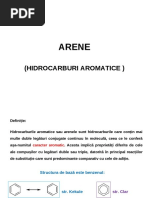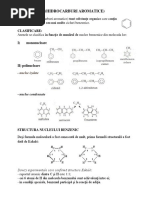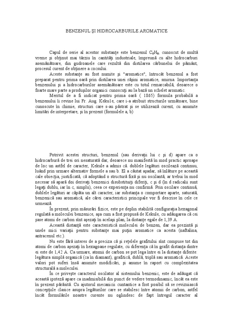 Capul de serie al acestor substane este benzenul C6H6, cunoscut de mult vreme i obinut mai trziu n cantiti industriale, mpreun cu alte hidrocarburi asemntoare, din gudroanele care rezult din distilarea crbunelui de pmnt, procesul curent de obinere a cocsului. Aceste substane au fost numite i "aromatice", ntruct benzenul a fost preparat pentru prima oar prin distilarea unei rini aromatice, smirna. Importana benzenului i a hidrocarburilor asemntoare este cu totul remarcabil, deoarece o foarte mare parte a produilor organici cunoscui au la baz un schelet aromatic. Meritul de a fi indicat pentru prima oar ( 1865) formula probabil a benzenului i revine lui Fr. Aug. Keku1e, care i-a atribuit structurile urmtoare, bine cunoscute n chimie, structuri care s-au pstrat i se utilizeaz curent, cu anumite limitri de interpretare, i n prezent (formulele a, b)