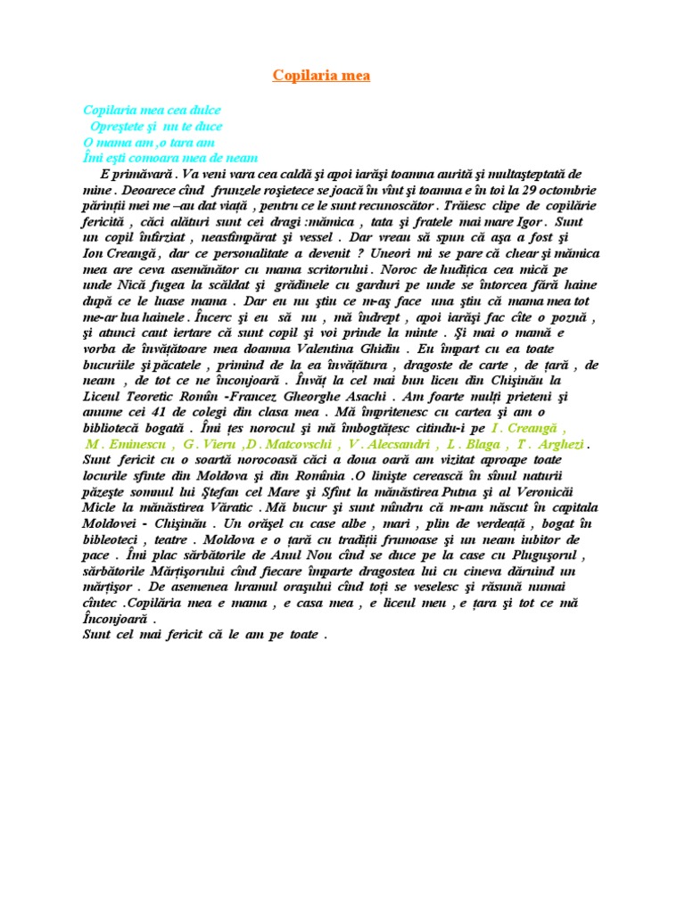 Copilaria mea cea dulce Opretete i nu te duce O mama am ,o tara am mi eti comoara mea de neam E primvar . Va veni vara cea cald i apoi iari toamna aurit i multateptat de mine . Deoarece cnd frunzele roietece se joac n vnt i toamna e n toi la 29 octombrie prinii mei me au dat via , pentru ce le sunt recunosctor . Triesc clipe de copilrie fericit , cci alturi sunt cei dragi :mmica , tata i fratele mai mare Igor . Sunt un copil ntrziat , neastmprat i vessel . Dar vreau s spun c aa a fost i Ion Creang , dar ce personalitate a devenit ? Uneori mi se pare c chear i mmica mea are ceva asemntor cu mama scritorului . Noroc de hudiica cea mic pe unde Nic fugea la scldat i grdinele cu garduri pe unde se ntorcea fr haine dup ce le luase mama . Dar eu nu tiu ce m-a face una tiu c mama mea tot me-ar lua hainele . ncerc i eu s nu , m ndrept , apoi iari fac cte o pozn , i atunci caut iertare c sunt copil i voi prinde la minte . i mai o mam e vorba de nvtoare mea doamna Valentina Ghidiu . Eu mpart cu ea toate bucuriile i pcatele , primind de la ea nvtura , dragoste de carte , de ar , de neam , de tot ce ne nconjoar . nv la cel mai bun liceu din Chiinu la Liceul Teoretic Romn -Francez Gheorghe Asachi . Am foarte muli prieteni i anume cei 41 de colegi din clasa mea . M mpritenesc cu cartea i am o bibliotec bogat . mi es norocul i m mbogtesc citindu-i pe I . Creang , M . Eminescu , G . Vieru ,D . Matcovschi , V . Alecsandri , L . Blaga , T . Arghezi . Sunt fericit cu o soart norocoas cci a doua oar am vizitat aproape toate locurile sfinte din Moldova i din Romnia .O linite cereasc n snul naturii pzete somnul lui tefan cel Mare i Sfnt la mnstirea Putna i al Veronici Micle la mnstirea Vratic . M bucur i sunt mndru c m-am nscut n capitala Moldovei - Chiinu . Un orel cu case albe , mari , plin de verdea , bogat n bibleoteci , teatre . Moldova e o ar cu tradiii frumoase i un neam iubitor de pace . mi plac srbtorile de Anul Nou cnd se duce pe la case cu Pluguorul , srbtorile Mriorului cnd fiecare mparte dragostea lui cu cineva druind un mrior . De asemenea hramul oraului cnd toi se veselesc i rsun numai cntec .Copilria mea e mama , e casa mea , e liceul meu , e ara i tot ce m nconjoar . Sunt cel mai fericit c le am pe toate .
