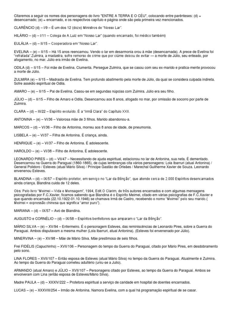= encarnado, e os respectivos captulo e pgina onde so pela primeira vez mencionados. CLARNCIO (d) I/9 um dos 12 (doze) Ministros de Nosso Lar. HILRIO (d) I/11 Colega de A.Luiz em Nosso Lar (quando encarnado, foi mdico tambm) EULLIA (d) II/15 Cooperadora em Nosso Lar. EVELINA (e) II/15 H 15 anos reencarnou. Vendo o lar em desarmonia orou me (desencarnada). A prece de Evelina foi refratada.Zulmira, a madastra, sofre remorso de crime que por cime deixou de evitar a morte de Jlio, seu enteado, por afogamento, no mar. Jlio era irmo de Evelina. ODILA (d) II/15 Foi me de Evelina. Ciumenta. Persegue Zulmira, que se casou com seu ex-marido e pratica-mente provocou a morte de Jlio. ZULMIRA (e) II/15 Madrasta de Evelina. Tem profundo abatimento pela morte de Jlio, da qual se considera culpada indireta. Sofre assdio espiritual de Odila. AMARO (e) II/15 Pai de Evelina. Casou-se em segundas npcias com Zulmira. Jlio era seu filho. JLIO (d) II/15 Filho de Amaro e Odila. Desencarnou aos 8 anos, afogado no mar, por omisso de socorro por parte de Zulmira. CLARA (d) III/22 Esprito evoludo. a Irm Clara do Captulo XXII. ANTONINA (e) VI/36 Valorosa me de 3 filhos. Marido abandonou-a. MARCOS (d) VI/36 Filho de Antonina, morreu aos 8 anos de idade, de pneumonia. LISBELA (e) VI/37 Filha de Antonina. criana, ainda. HENRIQUE (e) VI/37 Filho de Antonina. adolescente. HAROLDO (e) VI/38 Filho de Antonina. adolescente. LEONARDO PIRES (d) VII/47 Necessitando de ajuda espiritual, estacionou no lar de Antonina, sua neta. dementado. Desencarnou na Guerra do Paraguai (1860-1865), de cujas lembranas cita vrios personagens: Lola Ibarruri (atual Antonina) / General Polidoro / Esteves (atual Mrio Silva) / Prncipe Gasto de Orlees / Marechal Guilherme Xavier de Souza. Leonardo envenenou Esteves. BLANDINA (d) IX/57 Esprito protetor, em servio no Lar da Bno, que atende cerca de 2.000 Espritos desencarnados ainda criana. Blandina cuida de 12 deles. Obs: Pelo livro Meimei Vida e Mensagem, 1994, Edit.O Clarim, de trs autores encarnados e com algumas mensagens psicografadas por F.C.Xavier, ficamos sabendo que Blandina o Esprito Meimei, citado em vrias psicografias de F.C.Xavier e que quando encarnada (22.10.1922-01.10.1946) se chamava Irm de Castro, recebendo o nome Meimei pelo seu marido.( Meimei = expresso chinesa que significa amor puro). MARIANA (d) IX/57 Av de Blandina. AUGUSTO e CORNLIO (d) IX/58 Espritos benfeitores que amparam o Lar da Bno. MRIO SILVA (e) XV/94 Enfermeiro. o personagem Esteves, das reminiscncias de Leonardo Pires, sobre a Guerra do Paraguai. Ambos disputavam a mesma mulher (Lola Ibarruri, atual Antonina). (Esteves foi envenenado por Jlio). MINERVINA (e) XV/98 Me de Mrio Silva. Me prestimosa de seis filhos. Frei FIDLIS (Capuchinho) XVII/106 Personagem do tempo da Guerra do Paraguai, citado por Mrio Pires, em desdobramento pelo sono. LINA FLORES XVII/107 Ento esposa de Esteves (atual Mrio Silva) no tempo da Guerra do Paraguai. Atualmente Zulmira. Ao tempo da Guerra do Paraguai cometeu adultrio (uniu-se a Julio). ARMANDO (atual Amaro) e JLIO XVII/107 Personagens citado por Esteves, ao tempo da Guerra do Paraguai. Ambos se envolveram com Lina (ento esposa de Esteves/Mrio Silva). Madre PAULA (d) XXXIV/222 Protetora espiritual a servio de caridade em hospital de doentes encarnados. LUCAS (e) XXXVIII/254 Irmo de Antonina. Namora Evelina, com a qual h programao espiritual de se casar.
