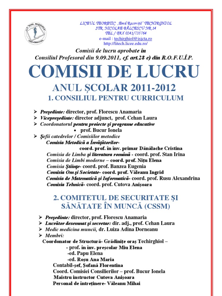 Preedinte: director adjunct, prof. Cehan Laura Vicepreedinte: Curcan Eugen, Inspector Situaii de Urgen Primria oraului Techirghiol Secretar lucrtor desemnat: prof. Creu Alexandru Membri: inst. Burlacu Adina prof. Ungureanu Oana m.i. Cutova Anioara prof. Zidaru Georgel prof. Caravasile Cristina Personal de ntreinere i paz: Abdula Nuredin Pndaru Neculai Vleanu Mihai