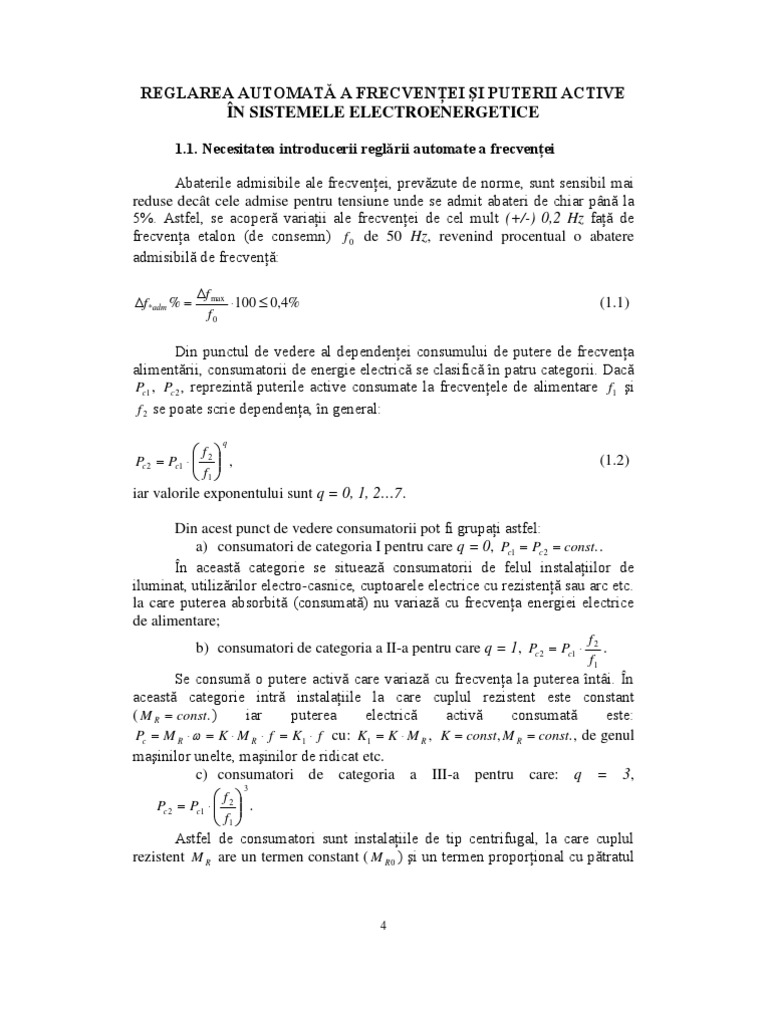 Reglarea Automată A Frecvenţei Şi Puterii Active În Sistemele Electroenergetice