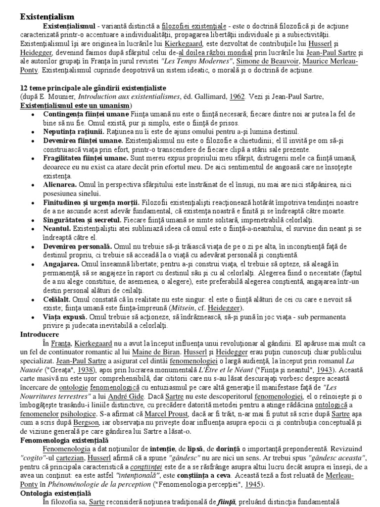 Existenialismul - variant distinct a filozofiei existeniale - este o doctrin filozofic i de aciune caracterizat printr-o accentuare a individualitii, propagarea libertii individuale i a subiectivitii. Existenialismul i are originea n lucrrile lui Kierkegaard, este dezvoltat de contribuiile lui Husserl i Heidegger, devenind faimos dup sfritul celui de-al doilea rzboi mondial prin lucrrile lui Jean-Paul Sartre i ale autorilor grupai n Frana n jurul revistei "Les Temps Modernes", Simone de Beauvoir, Maurice MerleauPonty. Existenialismul cuprinde deopotriv un sistem ideatic, o moral i o doctrin de aciune. 12 teme principale ale gndirii existenialiste (dup E. Mounier, Introduction aux existentialismes, d. Gallimard, 1962. Vezi i Jean-Paul Sartre, Existenialismul este un umanism) Contingena fiinei umane Fiina uman nu este o fiin necesar; fiecare dintre noi ar putea la fel de bine s nu fie. Omul exist, pur i simplu, este o fiin de prisos. Neputina raiunii. Raiunea nu i este de ajuns omului pentru a-i lumina destinul. Devenirea fiinei umane. Existenialismul nu este o filozofie a chietudinii; el l invit pe om s-i construiasc viaa prin efort, printr-o transcendere de fiecare clip a strii sale prezente. Fragilitatea fiinei umane. Sunt mereu expus propriului meu sfrit, distrugerii mele ca fiin uman, deoarece eu nu exist ca atare dect prin efortul meu. De aici sentimentul de angoas care ne nsoete existena. Alienarea. Omul n perspectiva sfritului este nstrinat de el nsui, nu mai are nici stpnirea, nici posesiunea sinelui. Finitudinea i urgena morii. Filozofii existenialiti reacioneaz hotrt mpotriva tendinei noastre de a ne ascunde acest adevr fundamental, c existena noastr e finit i se ndreapt ctre moarte. Singurtatea i secretul. Fiecare fiin uman se simte solitar, impenetrabil celorlali. Neantul. Existenialitii atei subliniaz ideea c omul este o fiin-a-neantului, el survine din neant i se ndreapt ctre el. Devenirea personal. Omul nu trebuie s-i triasc viaa de pe o zi pe alta, n incontien fa de destinul propriu, ci trebuie s accead la o via cu adevrat personal i contient. Angajarea. Omul nseamn libertate; pentru a-i construi viaa, el trebuie s opteze, s aleag n permanen, s se angajeze n raport cu destinul su i cu al celorlali. Alegerea fiind o necesitate (faptul de a nu alege constituie, de asemenea, o alegere), este preferabil alegerea contient, angajarea ntr -un destin personal alturi de ceilali. Cellalt. Omul constat c n realitate nu este singur: el este o fiin alturi de cei cu care e nevoit s existe; fiina uman este fiina-mpreun (Mitsein, cf. Heidegger). Viaa expus. Omul trebuie s acioneze, s ndrzneasc, s-i pun n joc viaa - sub permanenta privire i judecata inevitabil a celorlali. Introducere n Frana, Kierkegaard nu a avut la nceput influena unui revoluionar al gndirii. El apruse mai mult ca un fel de continuator romantic al lui Maine de Biran. Husserl i Heidegger erau puin cunoscui chiar publicului specializat. Jean-Paul Sartre a asigurat cel dinti fenomenologiei o larg audien, la nceput prin romanul La Nause ("Greaa", 1938), apoi prin lucrarea monumental L'tre et le Nant ("Fiina i neantul", 1943). Aceast carte masiv nu este uor comprehensibil, dar cititorii care nu s-au lsat descurajai vorbesc despre aceast ncercare de ontologie fenomenologic cu entuziasmul pe care alt generaie l manifestase fa de "Les Nourritures terrestres" a lui Andr Gide. Dac Sartre nu este descoperitorul fenomenologiei, el o renoiete i o mbogete trasndu-i liniile distinctive, cu precdere datorit metodei pentru a atinge rdcina ontologic a fenomenelor psihologice. S-a afirmat c Marcel Proust, dac ar fi trit, n-ar mai fi putut s scrie dup Sartre aa cum a scris dup Bergson, iar observaia nu privete doar influena asupra epocii ci i contribuia conceptual i de viziune general pe care gndirea lui Sartre a lsat-o. Fenomenologia existenial Fenomenologia a dat noiunilor de intenie, de lips, de dorin o importan preponderent. Revizuind "cogito"-ul cartezian, Husserl afirm c a spune "gndesc" nu are nici un sens. Ar trebui spus "gndesc aceasta", pentru c principala caracteristic a contiinei este de a se rsfrnge asupra altui lucru dect asupra ei nsei, de a avea un coninut: ea este astfel "intenional", este contiina a ceva. Aceast tez a fost reluat de MerleauPonty n Phnomnologie de la perception ("Fenomenologia percepiei", 1945). Ontologia existenial n filozofia sa, Sarte reconsider noiunea tradiional de fiin, prelund distincia fundamental hegelian ntre n-sine i pentru-sine. Clasic se afirma: exist ceea ce este!, nu se gsea n n-sine nici cel mai mic germen de dualitate, aceasta fiind fiina tuturor fenomenelor, adic a tuturor apariiilor care au loc n lumea