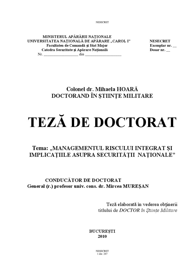 i n t e r n e ii n t e r n a i o n a l e , c r e a r e ac o n d i i i l o rp e n t r ud e c l a n a r e au n o rg e n u r id e a c i u n i o s t i l e s a u a g r e s i v e , c u i m p a c t a s u p r a i n t e r e s e l o r d e s e c u r i t a t e a l e s t a t u l u i . ne s e n , p r o c e s u l d em a n a g e m e n t d er i s cc o n s t ne v a l u a r e ar i s c u r i l o r i d e n t i f i c a r e a i e v a l u a r e a a m e n i n r i l o r i v u l n e r a b i l i t i l o r - i n d i m i n u a r e a l o rl u a r e ad e c i z i i l o rd ed i m i n u a r e ,a d o p t a r e am s u r i l o rd ec o n t r o l ,p r e c u m i m o n i t o r i z a r e a i e v a l u a r e a l o r . A s t f e l , a n a l i z a s t r a t e g i c i c o m p e t i t i v , c a p a r t e a p r o c e s u l u i m a n a g e m e n t u l u i d e r i s c , a j u t d e c i d e n i i s d e t e r m i n e c u mp o t f i r e d u s e s a ue v i t a t e p r o b l e m e l e s t r a t e g i c e i s i a d e c i z i i a d e c v a t e , nf u n c i e d e i m p o r t a n a r i s c u l u i i nr a p o r t c ur e z u l t a t e l em i s i u n i i . R e p r e z i n t om e t o d c a r ef a c i l i t e a z a l e g e r e ap l a n u l u i d ea c i u n eo p t i m i c a r eg a r a n t e a z c i m p l i c a i i l er i s c u r i l o r a s u m a t es u n t a c c e p t a t e , c o n s t i t u i n dop r o b l e m d ea t i t u d i n ec a r ep o a t er e a e z a p r o b l e m a t i c a l u r i i d e c i z i e i m i l i t a r e p e n o i f u n d a m e n t e . A c u m i na n i i c a r e v i n , d i r e c i a f u n d a m e n t a l e s t e c e a a a p r o p i e r i i n o a s t r e sistem i c e i i n t e g r r i i d e p l i n e ns t r u c t u r i l e m i l i t a r e e u r o -a t l a n t i c e , nc a d r u l c r o r a p r i m i m , d a r t r e b u i e i s o f e r i m , a c e l p l u s d e s e c u r i t a t e l a c a r e R o m n i a a s p i r n m o d n d r e p t i t , p eb a z aintereselor n a i o n a l e , ap o z i i e i g e o s t r a t e g i c ea r i i , a poten i a l u l u is ud e m o g r a f i c i , nu n ultimul rnd, al celui de intelligence. O b i e c t i v u lp r i n c i p a la la c e s t e io r i e n t r is t r a t e g i c ee s t ea c e l aa lm o d e r n i z r i i s i s t e m u l u ia p r r i in a i o n a l es u bt o a t ea s p e c t e l e , ns c o p u lr i d i c r i il an i v e l u l standardelor NATO, nv e d e r e ar e a l i z r i ii n t e r o p e r a b i l i t i in e c e s a r ei n t e g r r i i d e p l i n e n A l i a n i n s t r u c t u r i l e m i l i t a r e a l e U n i u n i i E u r o p e n e . D e z i d e r a t u l i n t e r o p e r a b i l i t i i o b l i g l am u l t e : c o m p a t i b i l i z a r e as t r u c t u r i l o r m i l i t a r e , m o d e r n i z a r e a n z e s t r r i it e h n i c o -mater i a l e , a d a p t a r e ac o n i n u t u l u i ia f o r m e l o rd ei n s t r u i r e ,c o n s t r u i r e au n e in o iv i z i u n ia s u p r as t a t u t u l u i ir o l u l u i s i s t e m u l u ia p r r i in a i o n a l e nn o u le a f o d a jp o l i t i c ,s o c i a l ie c o n o m i c , dobndirea unui nou mod de gndire cu privire la exercitarea come n z i i , l a r e l a i i l e i n t e r m i l i t a r e ,l am o t i v a i ad i f e r i t e l o rc a t e g o r i id ep e r s o n a l ,l ar a p o r t u r i l ec u s o c i e t a t e ac i v i l . A s t f e l d ea s p e c t e i m u l t ea l t e l en e c e s i t c o n s t i t u i r e au n e i n o i f i l o s o f i i m i l i t a r e , a j u s t a r e a i r e m o d e l a r e a s t r a t e g i e i i a t a c t i c i i . np r e z e n t , d a rm a ia l e s np e r s p e c t i v ,m u t a i i l ev i z n dm a n a g e m e n t u l ( c a r a c t e r u l a n t i c i p a t i v , l r g i r e ag a m e i m e t o d o l o g i i l o r d el u c r u , l ac a r es ea d a u g f l e x i b i l i t a t e aa c c e n t u a t as i s t e m e l o r m a n a g e r i a l e ) s ev o r p r o d u c e n t r -u nr i t m i m a ir a p i d .E v o l u i as o c i e t i i nd i r e c i ac r e t e r i ic a l i t i i nt o a t es e g m e n t e l e a c e s t e i an e c e s i t e f o r t it o t o d a t , n c a d r a r e aa c e s t e i a n t r -o s t r a t e g i ec a r es c o n d u c l a a t i n g e r e a s c o p u l u i u r m r i t . P r i n u r m a r e , n d o m e n i u l m i l i t a r t r e b u i e a v u t n vedere managementul ca l i t i i t o t a l e i a c i unea nc o n c o r d a n c ue x i g e n e l e strategiei adoptate m a n a g e m e n t u ls t r a t e g i c ,a d i c nb a z au n o ro b i e c t i v e s t r a t e g i c e b i n e s t u d i a t e , c u r e s u r s e p r e c i s s t a b i l i t e i p r a c t i c a s i g u r a b i l e , c u t e r m e n e