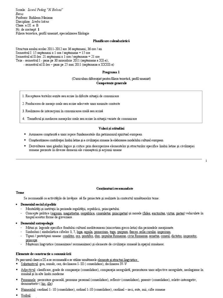 Elemente de construcie a comunicrii Pe parcursul clasei a IX-a se recomand a se utiliza urmtoarele elemente i structuri lingvistice: Substantivul: gen, numr, caz, declinarea I- III ( consolidare), declinarea IV-V Adjectivul: clasificare, grade de comparaie (consolidare), comparaia neregulat, prezentarea unor adjective neregulate, neologisme n romn i n alte limbi moderne Pronumele: prezentare general, pronume personal (consolidare), reflexiv (consolidare), posesiv (consolidare), relativ-interogativ, demonstrativ ( hic, ille) Numeralul: cardinal 1- 10 (consolidare), ordinal 1-10 (consolidare); cardinal zeci, sute, mii; cifre romane Verbul: sistematizare: - esse, verbe regulate tema prezentului, diateza activ: modul indicativ (prezent, imperfect, viitor I), modul conjunctiv (prezent, imperfect);