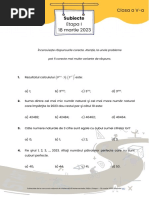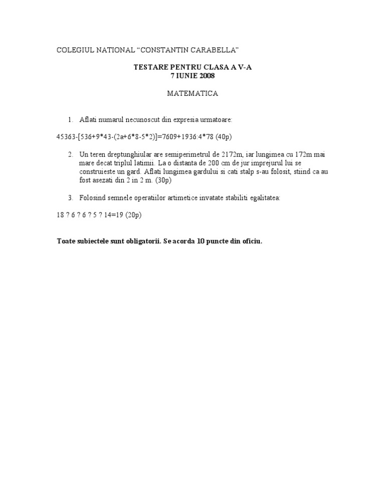 Aflati numarul necunoscut din expresia urmatoare: 45363-[536+9*43-(2a+6*8-5*2)]=7609+1936:4*78 (40p) 2. Un teren dreptunghiular are semiperimetrul de 2172m, iar lungimea cu 172m mai mare decat triplul latimii. La o distanta de 200 cm de jur imprejurul lui se construieste un gard. Aflati lungimea gardului si cati stalp s-au folosit, stiind ca au fost asezati din 2 in 2 m. (30p) 3. Folosind semnele operatiilor artimetice invatate stabiliti egalitatea: 18 ? 6 ? 6 ? 5 ? 14=19 (20p) Toate subiectele sunt obligatorii. Se acorda 10 puncte din oficiu.